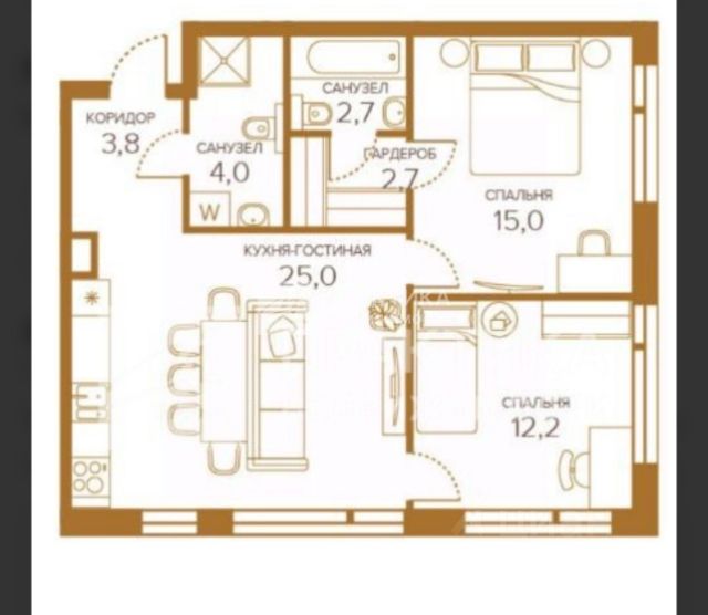 - план: кухня-гостиная и две спальни, две гардеробные и два сан.узла, почти все стены не несущие;