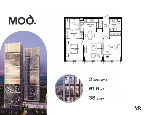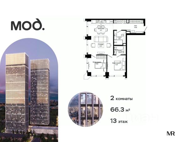 Прямая продажа от застройщика. Продается 2-комнатная квартира общей площадью 65.80 м² с предчистовой отделкой в ЖК премиум-класса Мод на 49-м этаже 55 этажного дома. Мод - жилой комплекс премиум-класса в историческом районе Москвы Марьина Роща, состоящий из трех клубных домов (9 этажей) и трёх разноэтажных башен (44-55 этажей). Закрытая территория жилого комплекса, продуманное благоустройство, эксплуатируемые кровли стилобата, образовательный центр с детским садом создают приватное пространство для тихой семейной жизни, а городская площадь с фонтанами, ресторан, супермаркет, коммерческая инфраструктура на первых этажах привносят созвучную с ритмом города динамику. Преимущества проекта: - В шаговой доступности новый деловой кластер Москвы - Выразительная авторская архитектура - Единственные в Москве фасады башен из натурального камня - Панорамное остекление и высота потолков до 4,8 м - Квартиры и апартаменты с отделкой MR Base - Многоуровневое благоустройство с зонированием на закрытой территории - Многофункциональный образовательный детский центр с детским садом - Двухуровневый подземный паркинг Транспортная доступность: - 5 минут пешком до станции метро "Марьина Роща" - 3 минуты до ТТК - 15 минут до Цветного бульвара Компания MR предлагает своим клиентам специальные условия приобретения квартир в рамках программ ипотечного кредитования от банков-партнеров.
