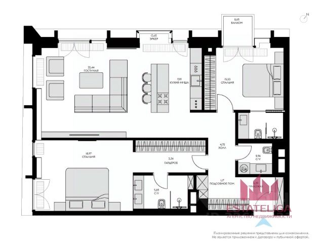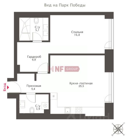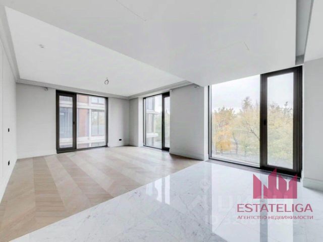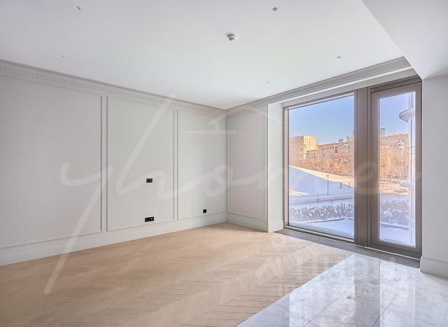 Квартира с двумя спальнями 116,8 м² и террасой 89,8 м² общей площадью 143,8 м² (терраса учтена с понижающим коэффициентом 0,3 ) в комплексе премиум-класса Victory Park Residences рядом с Парком Победы. Квартира с готовой дизайнерской отделкой от застройщика в стиле "неофактура" расположена на первом этаже в корпусе 4. Окна выходят на две стороны, с видом в Victory Garden.