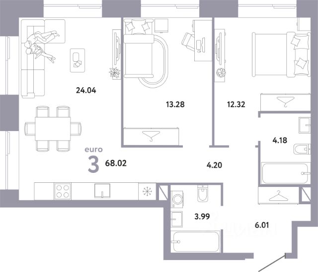 Продаётся 2-комнатная квартира в строящемся доме (ГРИН), срок сдачи: IV-кв. 2027, общей площадью 68.02 кв.м., на 24 этаже.