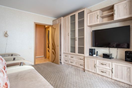 Три встроенных зеркальных шкафа-купе, добротная кухня, вполне современная мебель, все необходимое из техники (холодильник, стиральная машина-автомат, посудомоечная машина, электрическая плита, духовой шкаф, вытяжка и др.)
