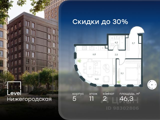 Цена указана с учётом скидки при 100%-й оплате, несубсидированной ипотеке, рассрочке (кроме программы "Рассрочка 0%"). В активно развивающемся районе на юго-востоке столицы продается 2-комнатная квартира площадью 42 кв.м с отделкой "white box".. Квартира расположена на 2 этаже 29-этажного этажного корпуса 5 в жилом комплексе комфорт-класса Level Нижегородская (компания Level Group/Левел групп). Отличная транспортная доступность - 10 мин. пешком до станции метро, МЦД-4, БКЛ и МЦК "Нижегородская"; - 13 мин. пешком до станций метро "Андроновка" и "Перово"; - 10 мин. на авто до ТТК; - 14 мин. на авто до Садового кольца. Благоустройство Благоустроенная территория комплекса делится на внешнюю и внутреннюю. Внутренняя часть - это закрытый двор 0,9 га, где обустраиваются детские площадки для разных возрастных групп, беседки для отдыха и работы, несколько спортивных зон, включая воркаут-зоны и лужайку для бадминтона. Здесь же появится ухоженный луг с прогулочными маршрутами. Рядом с жилым комплексом будет создан ландшафтный парк площадью 2,4 га. В парке будут высажены высокие деревья, луговые травы и кустарники, благоустроены лаунж-зоны у пруда, дорожки для бега и прогулок. В центре парка предусмотрена событийная площадь, рядом расположатся дополнительные спортивные и детские площадки, а также зона для выгула домашних питомцев. Внутренняя инфраструктура Дома жилого комплекса будут оснащены коммерческими помещениями, где откроются все необходимые сервисы: магазины, аптеки, салоны красоты, кофейни, службы доставки и многое другое. Комфорт - это когда всё рядом. Кроме того, на территории Level Нижегородская предусмотрен подземный отапливаемый паркинг. Этап 1 включает 335 машино-мест и 143 кладовых помещения для хранения сезонных вещей. Технологии и безопасность На территории всех общественных зон постоянно ведется видеонаблюдение и предусмотрен высокоскоростной Wi-Fi. Подъезды, паркинг и внутренний двор оснащены системой контроля доступа. Для удобства жителей создано мобильное приложение, позволяющее связаться с управляющей компанией, осуществлять удаленное управление видеодомофоном или просмотреть изображение отдельных видеокамер по заявке. Для безопасного перемещения по этажам и комфортного спуска в паркинг будут установлены современные лифты от компании BLT Brilliant Elevator. Скорость лифтов - 1,6 - 2,5 м/с. Особенности - Архитектура от экспертов из бюро ARCH(E)TYPE; - Разноуровневая застройка - от секций средней этажности до высоток в 45 этажей (этап 1); - Окна шириной до 2,2 метров (этап1) с видами на Останкинскую башню, Измайловский парк, "Москва-Сити" и Кусковский лесопарк; - Лобби с окнами в пол и потолками от 3,4 метров, оснащенные консьерж-сервисом; - Более 35 видов планировок, включая редкие форматы. Артикул 5-12.