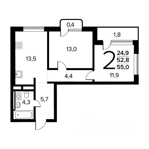 В квартире максимально продумана планировка, позволяющая использовать пространство выгодно и удобно. Общая площадь квартиры составляет 55,9 кв.м с жилой площадью 32 кв. м, в которой совмещена просторная кухня- гостинная 19.5 кв. м, с выходом на большой балкон, светлая спальня, окна которой выходят на тихий двор и детская комната 9.5 кв.м. Квартира теплая, изолированная, с хорошей шумоизоляцией.