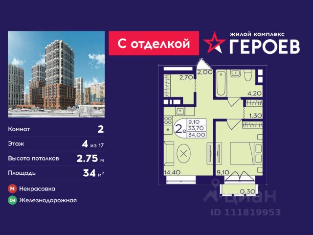 Продаётся 2-комнатная квартира 39.4 кв. м. в жилом комплексе "Героев" в Балашихе, Железнодорожный. Квартира расположена на 12 этаже 407 корпуса. Все квартиры представлены с чистовой отделкой. Вам не нужно тратить время и дополнительные финансы на ремонт или жить в шуме строительных работ - достаточно перевести свои вещи, расставить мебель и всё готово! Жилой квартал "Героев" - это уютный проект для семей с детьми. Всего 40 минут до центра Москвы. В квартале созданы все условия для досуга всех возрастов: игровые и спортивные площадки, места для отдыха и прогулок, магазины, кафе и пункты выдачи. За 15 минут можно дойти от дома до Ольгинского лесопарка - популярного места для прогулок и отдыха на свежем воздухе. Здесь приятно гулять всей семьёй, заниматься спортом или устроить пикник в выходной день. Преимущества: Квартира с готовой отделкой. Пространство полностью подготовлено для жизни: не нужно тратить время и деньги на ремонт или ждать его окончания. После получения ключей достаточно расставить мебель - и можно сразу заезжать и жить. Продуманные и светлые планировки. Просторные кухни-гостиные создают комфортное пространство для отдыха и встреч с близкими. В квартирах предусмотрены удобные гардеробные, благодаря чему легко поддерживать порядок и не перегружать комнаты шкафами. Увеличенное остекление. Большие окна наполняют квартиру естественным светом в течение всего дня, создавая ощущение простора и уюта, а также визуально расширяя пространство и делая интерьер более воздушным. Пешая доступность до станции Железнодорожная (МЦД-4) - дорога займёт не более 30 минут до центра Москвы: станции метро "Курская", "Площадь Ильича" или ТПУ Нижегородская.