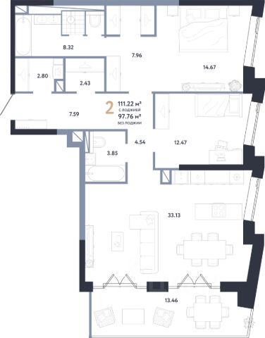 Продаётся 2-комнатная квартира в строящемся доме (РЕДС 2), срок сдачи: I-кв. 2026, общей площадью 97.06 кв.м., на 11 этаже.