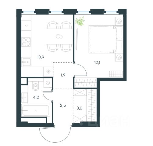 Квартира состоит из комнаты-спальни площадью 14 м2 и кухни-гостиной площадью 19 м2, без отделки, в бетоне. Установлены двухкамерные стеклопакеты, смонтированы системы отопления, заведены все коммуникации.