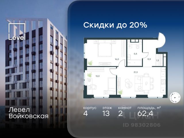 Цена указана с учётом скидки при 100%-й оплате, несубсидированной ипотеке, рассрочке (кроме программы "Рассрочка 0%"). Продается 2-комнатная квартира площадью 62.80 кв. м с отделкой. Квартира находится на 19 этаже 26-этажного корпуса 4, в новом жилом комплексе бизнес-класса Левел Войковская, расположенном рядом с живописным заповедником "Покровское-Стрешнево" (застройщик - компания Level Group/Левел групп). Прекрасная транспортная доступность - 7 мин. пешком до станции МЦК "Балтийская"; - 15 мин. пешком до станции метро "Войковская"; - 8 мин. на машине до ТТК; - 15 мин. на машине до центра Москвы; - 20 мин. на машине до Москва-Сити. Продуманный архитектурный проект - стильная архитектура от мастерской Фефелова В. В.; - панорамные виды на парки, Химкинское водохранилище и Останкинскую башню; - лобби с высотой потолков до 6,45 метров; - более 20 видов планировок, включая редкие форматы квартир с террасой и увеличенной высотой потолков до 5,42 метров; - 2 варианта дизайнерской отделки в корпусе 4 как дополнительная опция к предчистовой отделке: стиль Модерн в светлых холодных тонах и стиль Классик в нейтральной бежевой гамме. Квартиры в корпусах 3 и 5 сдаются без отделки. Расположение Жилой комплекс Левел Войковская строится в престижном Северном округе Москвы, где развитая инфраструктура и живописная природа переплетаются в единый ансамбль. Войковский район окружают парки и набережные. В шаговой доступности - парк "Покровское-Стрешнево", не более 15-ти минут на велосипеде занимает путь до Тимирязевского парка и 9-ти минут до парка усадьбы Михалково. Рядом более 60 школ, 75 дошкольных учреждений, 17 государственных и 6 частных вузов, 25 супермаркетов, 4 торговых центра, среди которых ТЦ "Метрополис" и ТЦ "Авиапарк". Внутренняя инфраструктура На территории жилого комплекса предусмотрены коммерческие помещения: кафе, ресторан, пекарня и другие сервисы на первых этажах корпусов. Для жителей будет доступен отапливаемый подземный паркинг на 244 машино-места с доступом с любого этажа на лифте. На территории паркинга будет расположено 125 кладовых помещений для хранения сезонного инвентаря. Лобби и благоустройство Дизайн лобби жилого комплекса Левел Войковская создан совместно с бюро "Бланк Архитектс" (Blank Architects). Теплая цветовая гамма, ресепшен, зоны ожидания, лапомойки и гостевые санузлы - каждая деталь превращает лобби в комфортное продолжение вашего дома. 1,15 га площади в первых двух этапах строительства отведено под приватный внутренний двор, который спроектирован совместно с бюро "Правда". Детские площадки для всех возрастов, спортивные пространства для йоги, уличных тренировок и петанка, уютные зоны для тихого отдыха или работы. Здесь утро начинается с вдохновения, а вечер наполнен приятными моментами. Лифты Комфортное перемещение внутри жилого комплекса обеспечат надёжные лифты с доступом в паркинг с жилых этажей. В каждом корпусе предусмотрено по 3 грузопассажирских лифта.