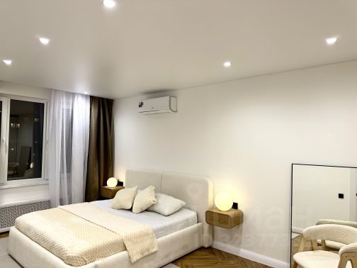 В спальне установлена удобная двуспальная кровать с мягким изголовьем, по бокам — подвесные тумбы, создающие атмосферу уюта и комфорта. По всей ширине стены расположен встроенный шкаф от пола до потолка, обеспечивающий максимум места для хранения. Также предусмотрено место под рабочую зону или консоль, а для вашего удобства установлен современный кондиционер.