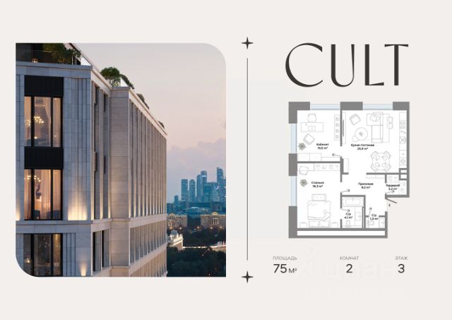 Продается 2-комнатная квартира площадью 75,1 кв.м. на 2-м этаже 9-этажного Клубного дома CULT. Высота потолков 3,2 м. Клубный дом CULT на Якиманке, где открывается редкая панорама на башни Кремля и главную высотную доминанту современной Москвы — небоскрёбы Сити, сталинские высотки и Храм Христа Спасителя, живописные парки и водную гладь реки. Элегантный внешний вид проекта — результат профессиональной работы международного архитектурного бюро СПИЧ. Быть его резидентом — значит выбирать совершенство. Клубный дом CULT в списке лучших элитных проектов Москвы по версии Forbes, Robb Report, Urban Awards и премии "Рекорды рынка недвижимости" 2-комнатной квартиры с евроремонтом в районе Якиманка в Москве.