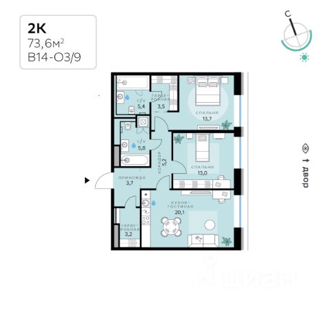 В продаже — двухкомнатная квартира с чистовой отделкой, общей площадью 65,94 кв. м. Квартира расположена на первом этаже одинадцатиэтажной секции дома класса Адвансд в новом районе СберСити, который строит Сбер. Дом находится на первой береговой линии Москвы-реки. Дом возводится по технологии монолитного строительства. Отделка фасадов выполнена из природного камня, глазурованной плитки и алюминия. В квартире проведены работы по улучшению шумоизоляции, установлены двухкамерные стеклопакеты с низкоэмиссионными стёклами, минимизирующими теплопотери. В санузлах — тёплый пол. В доме расположены: • уютное лобби, • лапомойка, • общественная терраса, • коворкинг для жителей, • собственная спортивная студия, • колясочная и велосипедная комната на первом этаже, • детская игровая комната, • подземный паркинг. СберСити — это новый жилой и деловой район на западе Москвы, в одном из самых экологически чистых и престижных мест столицы. Это первая в России и крупнейшая в мире инновационная городская среда, созданная по международным стандартам зелёного проектирования. Здесь внедряются решения в области энергоснабжения, вакуумного мусороудаления, тестирования зелёных технологий, а в дальнейшем — системы искусственного интеллекта для управления домами и городской инфраструктурой. Строительство проекта началось в 2021 году, заселение первых корпусов — с лета 2024-го. Общая площадь территории — 461 га, из них более 2,5 млн кв. м жилья и около 833 тыс. кв. м офисных пространств. Будет построено 7 школ, 13 детских садов и 2 поликлиники. В СберСити будут жить 65 тыс. человек и работать 70 тыс. Развитием территории занимается АО "Рублёво-Архангельское", входящее в группу Сбер. СберСити — место, где хочется жить, работать и растить детей. Переезжайте в СберСити!