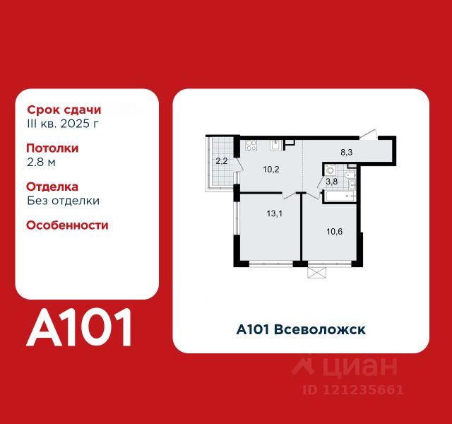 2-комнатная квартира площадью 45.90 в ЖК "А101 Всеволожск" c лоджией на 9 этаже. Квартира white box. Вид из окна во двор. В квартире 1 санузел. Высота потолков 2.8 м. Предложения от застройщика на декабрь 2025: - Гибкая рассрочка 20 000 руб/мес. и первым взносом 10%. ОТДЕЛКА Квартира с предчистовой отделкой предполагает: качественную стяжку на полах под финишное покрытие, потолок с обеспыливающей грунтовкой белого цвета, ровные стены с покрытием штукатурка. Выполнены все работы по проведению электрики. На все отделочные работы от застройщика предоставляется гарантия. Если вы хотите дозаказать дизайнерскую отделку, обращайтесь к нашими специалистами. ОСОБЕННОСТИ ПЛАНИРОВКИ ПАРАДНАЯ В каждой парадной предусмотрены места для хранения велосипедов и колясок, гостевой санузел, лапамойка (место для мытья домашних животных или колес велосипедов) и удобная зона ожидания для гостей. ДВОРЫ И ОКРУЖЕНИЕ Просторные дворы свободны от машин и закрыты от посторонних. Большую часть комплекса займут благоустроенные зелёные зоны, теневые сады и городские общественные пространства с развитой тротуарной сетью и велодорожками. Каждый дом оборудован системами видеонаблюдения и контроля доступа. Не хватает средств на покупку кладового помещения? Оформите ипотеку на квартиру и добавьте к ней часть стоимости кладовой. ЗАСТРОЙЩИК ГК "А101" - крупный инвестиционно-строительный холдинг, занимает 6-е место по объему строительства в России (по данным "Единого ресурса застройщиков" на 2023 год). НКР присвоило ГК "А101" кредитный рейтинг A+.ru, подтверждая его надежность и финансовую устойчивость для завершения строительства ЖК.