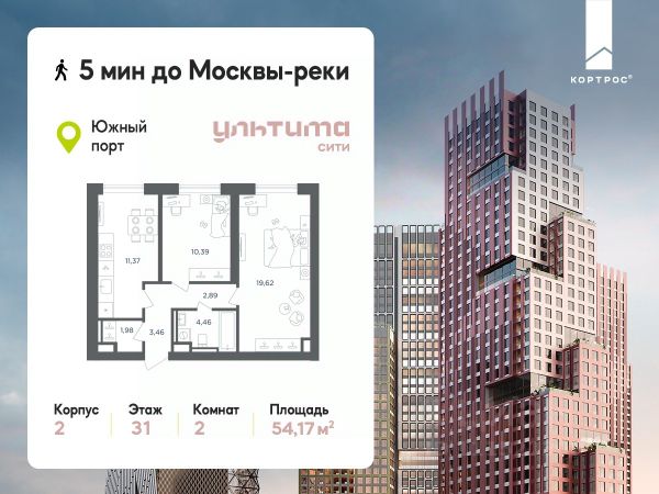 Предложение месяца от застройщика: - Скидка до 10% на ограниченный пул квартир - Рассрочка 0% на 1 год - Семейная ипотека без удорожания, ставка 4% - Ипотека для всех на весь срок, ставка 11,89% Продаётся 2-комнатная квартира от застройщика ГК "КОРТРОС" в жилом комплексе бизнес-класса УЛЬТИМА Сити. Квартира расположена на 24 этаже 45 этажного корпуса 1. Общая площадь 52,16 м². Без отделки. УЛЬТИМА Сити — жилой комплекс бизнес-класса в перспективном районе на юго-востоке Москвы. На его территории появятся 9 башен на 756 этажей, двухуровневый подземный паркинг, собственная инфраструктура, включая детский сад и школу. Всего девелопер благоустроит территорию в 2,6 га. Ближайшая станция метро — "Южный порт". Она откроется в 2028 году и будет находиться в 2-х минутах ходьбы. А прямо напротив расположится остановка водного автобуса-электрохода "Синичка". Дорога от квартала будет удобна и для автомобилистов: - до Кремля — 12 км - до МКАД — 12 км - до выезда на ТТК — 3 км - до Садового кольца — 8 км В двух корпусах первой очереди УЛЬТИМА Сити этажностью 45 и 52 реализуется 1 079 квартир с продуманными, рациональными планировочными решениями. В ассортиментной линейке представлены однокомнатные квартиры от 28,2 до 61 кв. м, двухкомнатные лоты от 44,3 до 95,4 кв. м, квартиры с тремя (71 — 115,57 кв. м) и четырьмя спальнями (106,6 — 114,97 кв. м). В экспозиции также есть квартиры с террасами, лоджиями, тремя и четырьмя санузлами, а также с функциональными нишами-кладовыми на кухнях. Запроектированы и эксклюзивные двухуровневые резиденции со вторым светом, в том числе с видом на Москву-реку, площадью от 77,7 до 141,9 кв. м. В рамках проекта запланировано строительство 9 корпусов, школы на 500 учащихся и детского сада на 225 мест. Еще будет создана продуманная инфраструктура для жителей: детские и спортивные площадки, амфитеатр для мероприятий, беседки и теплицы для садоводства, коворкинг, детский клуб и ресторан с открытой террасой. Доступ в жилой комплекс осуществляется по биометрическому контролю. Вокруг квартала будет приватная территория с видеонаблюдением и консьерж-сервисом 24/7. Лобби корпусов будут иметь двойные выходы: на улицу и во внутренний закрытый двор.