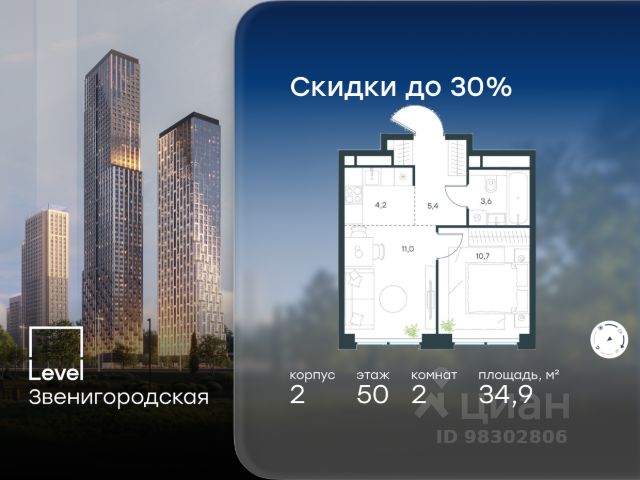 Цена указана с учётом скидки при 100%-й оплате, несубсидированной ипотеке, рассрочке (кроме программы "Рассрочка 0%"). В жилом квартале продаётся 2-комнатная квартира площадью 36.80 кв.м без отделки. Квартира расположена на 3 этаже 64 этажного корпуса 2 в жилом комплексе комфорт класса Level Звенигородская (компания Level Group/Левел групп). Отличная транспортная доступность - 5 мин. пешком до метро "Звенигородская" (откроется к окончанию строительства); - 18 мин. пешком до станции МЦК "Хорошёво" и станции БКЛ "Народное ополчение"; - 4 мин. на авто до ТТК; - 8 мин. на авто до Садового кольца; - 15 мин. на авто до Кремля. Продуманный архитектурный проект - Концепция от студии Станислава Михаловского, в основу которой легло единение природы и города; - Двухкамерные стеклопакеты в окнах, алюминиевый и ПВХ профиль - в квартирах тепло зимой и прохладно летом; - С верхних этажей откроются панорамные виды на город, Москву-реку, "Москва-Сити" и Москворецкий парк; - Лобби со всеми удобствами: окна в пол, высокие потолки до 4,7 м, лаунж-зоны, колясочные, гостевые санузлы и мойки для лап животных; - Централизованные водонагреватели гарантируют круглогодичную подачу горячей воды в каждую квартиру. Благоустройство Концепция благоустройства разработана совместно с бюро UNK landscape. Высота башен приближается к 200 метрам - они словно касаются неба. Небесный простор проецируется на территорию двора с помощью подсветки, визуально увеличивая пространство и отражаясь в авторских элементах архитектуры. На территории площадью 0,45 га расположатся: - "Облако событий" - место встреч и общения; - "Облако спорта" - всё для поддержания себя в форме; - "Облако принятия решений" - пространство для работы на свежем воздухе; - "Облако спокойствия" - для отдыха в тишине природы; - "Облако игр" - площадки для подростков и самых маленьких. Инфраструктура В жилом комплексе откроется 21 коммерческое помещение: продуктовые лавки, кафе, салоны красоты, службы доставки и творческие студии. Этап 1 включает строительство двухуровневого подземного паркинга. Всего здесь расположится 351 машино-место, включая семейные места, и 264 кладовых помещения. В распоряжении жителей развитая инфраструктура района: 15 супермаркетов, 5 спортивных объектов, 9 медучреждений, 7 детских садов, 4 школы, 3 благоустроенных парка - всё в шаговой доступности. Инженерия Комфортное перемещение внутри домов будут обеспечивать надёжные лифты с доступом в паркинг с жилых этажей. В каждом корпусе предусмотрено до шести кабин, включая сервисные лифты. Попасть на территорию комплекса можно только по единому ключу доступа. Видеонаблюдение установлено на входах в подъезды, в лобби, в общих зонах, на въезде в паркинг. Гости смогут связаться с жителями дома через входные видеопанели, а управлять доступом на территорию можно через видеодомофон или приложение на телефоне.