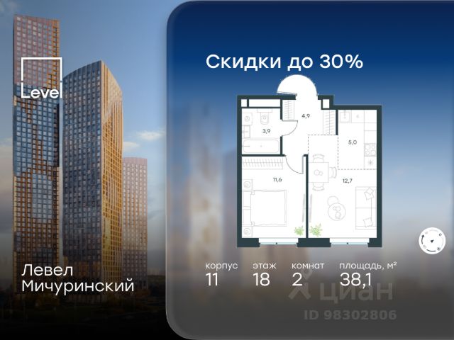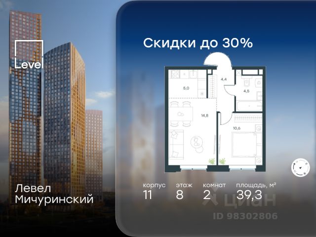 Скидка 35% на все квартиры в жилом комплексе Левел Мичуринский, этапы 3 и 4 (корпуса 7-13). Цена указана с учётом скидки при 100%-й оплате, несубсидированной ипотеке, рассрочке (кроме программы "Рассрочка 0%"). В жилом квартале, расположенном на границе с природным заказником "Долина реки Очаковки", продаётся 2-комнатная квартира площадью 42.40 кв.м с отделкой white box. Квартира расположена на 3 этаже 42-этажного корпуса 10 в жилом комплексе бизнес-класса Левел Мичуринский (компания Level Group/Левел групп). Отличная транспортная доступность: - от 10 мин. пешком до станции метро "Мичуринский проспект" - 15 мин. пешком до станции метро "Аминьевская" - 7 мин. на авто до МКАД - 10 мин. на авто до ТТК - 15 мин. на авто до Москва-Сити Продуманный архитектурный проект: - Выразительная архитектура от известных бюро: корпуса 1-6 - СПИЧ, корпуса 7-13 - Borisov Architects; - Из окон открываются живописные виды на парки, Москва-Сити и МГУ; - Высокие потолки до 6,35 м; - Стильные лобби с окнами в пол и высокими потолками до 4,7 м; - С каждого этажа дома на лифте можно спуститься в подземный отапливаемый паркинг. Расположение: Жилой комплекс Левел Мичуринский строится в одном из самых зелёных районов Москвы - Очаково-Матвеевское. Этот уголок столицы идеален для поддержания здорового образа жизни. В шаговой доступности от проекта находятся заказник "Долина реки Очаковки" - 1 мин. пешком и Очаковский парк - 7 мин. пешком. На велосипеде можно добраться до таких парков, как "Событие", парк Олимпийской деревни, парк 50-летия Октября и парк Школьников. В 15 минутах езды на авто расположено более 30 детских садов (из них 14 в пешей доступности), 32 школы (из них 13 в пешей доступности) и 14 вузов. Также в ближайшем окружении - более 25 медицинских учреждений, 11 спортивных клубов и 22 продуктовых супермаркета. Внутренняя инфраструктура: На территории жилого комплекса строится три детских сада и школа. На первых этажах домов откроется супермаркет, фитнес-центр, ресторан, кафе и другие сервисы. Подземные этажи займут паркинги: трёхуровневые - в этапах 1 и 2, одноуровневый - в этапах 3 и 4. Преимущества проекта: - 4,5 га благоустроенной территории с видовым мостом, уличным кинотеатром, зонами для тихого отдыха, работы, воркаута, площадки для петанка, футбола, настольного тенниса и пляжного волейбола. - Дизайнерские лобби с панорамным видом на двор, мойками для лап животных и комфортными зонами ожидания. - Безопасность жителей: круглосуточное видеонаблюдение всех зон общего пользования (лобби, лифты, паркинги, детские площадки), система контроля доступа, управление видеодомофоном через мобильное приложение, единый ключ доступа на территорию жилого комплекса. - Технологии и комфорт: высокоскоростной Wi-Fi в лобби и на придомовой территории, автоматическая система контроля и учёта ресурсов, абонентская связь с консьержем, распознавание номеров автомобилей при въезде в паркинг и выезде из него.