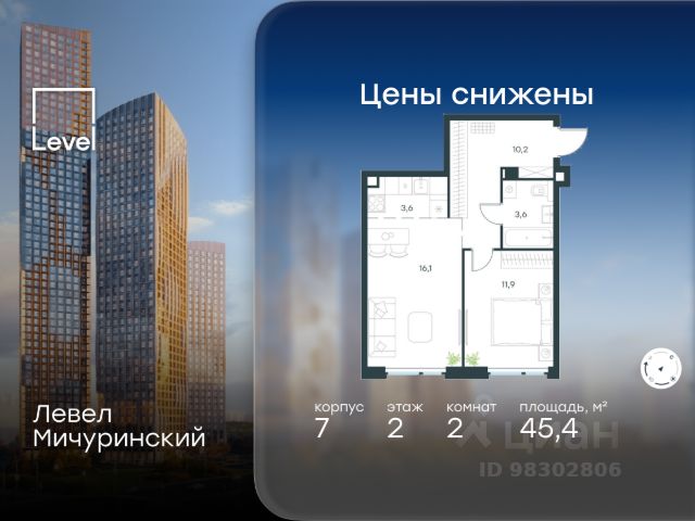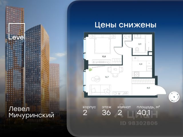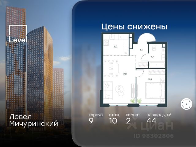 Скидка 35% на все квартиры в жилом комплексе Левел Мичуринский, этапы 3 и 4 (корпуса 7-13). Цена указана с учётом скидки при 100%-й оплате, несубсидированной ипотеке, рассрочке (кроме программы "Рассрочка 0%"). В жилом квартале, расположенном на границе с природным заказником "Долина реки Очаковки", продаётся 2-комнатная квартира площадью 42.10 кв.м без отделки. Квартира расположена на 6 этаже 48-этажного корпуса 8 в жилом комплексе бизнес-класса Левел Мичуринский (компания Level Group/Левел групп). Отличная транспортная доступность: - от 10 мин. пешком до станции метро "Мичуринский проспект" - 15 мин. пешком до станции метро "Аминьевская" - 7 мин. на авто до МКАД - 10 мин. на авто до ТТК - 15 мин. на авто до Москва-Сити Продуманный архитектурный проект: - Выразительная архитектура от известных бюро: корпуса 1-6 - бюро СПИЧ, корпуса 7-13 - архитектурное бюро Анатолия Борисова; - Из окон открываются живописные виды на парки, Москва-Сити и МГУ; - Высокие потолки до 6,35 м; - Стильные лобби с окнами в пол и высокими потолками до 4,7 м; - С каждого этажа дома на лифте можно спуститься в подземный отапливаемый паркинг. Расположение: Жилой комплекс Левел Мичуринский строится в одном из самых зелёных районов Москвы - Очаково-Матвеевское. Этот уголок столицы идеален для поддержания здорового образа жизни. В шаговой доступности от проекта находятся заказник "Долина реки Очаковки" - 1 мин. пешком и Очаковский парк - 7 мин. пешком. На велосипеде можно добраться до таких парков, как "Событие", парк Олимпийской деревни, парк 50-летия Октября и парк Школьников. В 15 минутах езды на авто расположено более 30 детских садов (из них 14 в пешей доступности), 32 школы (из них 13 в пешей доступности) и 14 вузов. Также в ближайшем окружении - более 25 медицинских учреждений, 11 спортивных клубов и 22 продуктовых супермаркета. Внутренняя инфраструктура: На территории жилого комплекса строится три детских сада и школа. На первых этажах домов откроется супермаркет, фитнес-центр, ресторан, кафе и другие сервисы. Подземные этажи займут паркинги: трёхуровневые - в этапах 1 и 2, одноуровневый - в этапах 3 и 4. Преимущества проекта: - 4,5 га благоустроенной территории с видовым мостом, уличным кинотеатром, зонами для тихого отдыха, работы, уличных тренировок, площадки для петанка, футбола, настольного тенниса и пляжного волейбола. - Дизайнерские лобби с панорамным видом на двор, мойками для лап животных и комфортными зонами ожидания. - Безопасность жителей: круглосуточное видеонаблюдение всех зон общего пользования (лобби, лифты, паркинги, детские площадки), система контроля доступа, управление видеодомофоном через мобильное приложение, единый ключ доступа на территорию жилого комплекса. - Технологии и комфорт: высокоскоростной вайфай в лобби и на придомовой территории, автоматическая система контроля и учёта ресурсов, абонентская связь с консьержем, распознавание номеров автомобилей при въезде в паркинг и выезде из нег