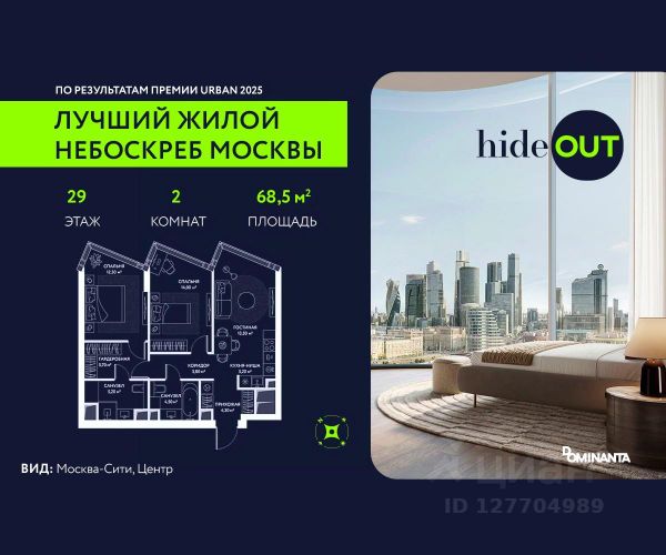 Прямая продажа от застройщика. Продается 2-комнатная квартира площадью 71,5 кв.м. на 4-м этаже 34-этажного дома в ЖК hideOUT с панорамными видами: Во двор. Высота потолков 3,25 м. hideOUT — премиальный проект компании Dominanta. Это новый уровень жизни и комфорта без компромиссов. Две башни — 34 и 49 этажей — открывают захватывающие виды на Москву. Архитектурной доминантой проекта становится мост, соединяющий башни на высоте 80 метров. Закрытая территория, охрана 24/7, зона экстренной безопасности на подземном уровне, система пожаротушения. На мосту между башнями на 22-м этаже находится SocialHUB — предусмотрено 16 комфортных пространств для работы, отдыха и развлечений с панорамными видами и клубным форматом доступа. Концепция благоустройства hideOUT — баланс между природой и технологичным городом будущего. На территории сада предусмотрены 15 зон для отдыха, работы, спорта и детей. Знаковым местом станет центральная площадь с амфитеатром и водопадом — сочетание камней, растений и струящейся воды создает идеальный баланс с природой. В проекте действуют привлекательные условия покупки: - семейная ипотека на старых условиях - успейте вдвое больше до 31.01.2026. - скидка до 20% при 100% оплате стоимости лота и ипотеке без субсидирования. Предложение действует до 31.01.2026. - рассрочка 0% на 3 года с первоначальным взносом от 20%. Период рассрочки до 36 месяцев. Застройщик АО "СЗ "ХАЙДАУТ", ИНН 7729058636, ОГРН 1027739319420. Проектная декларация на сайте наш.дом.рф. Предложение не является публичной офертой.