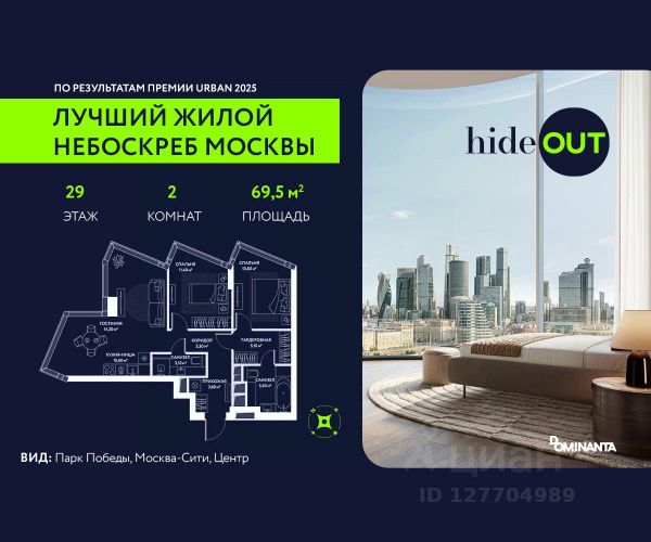 Прямая продажа от застройщика. Продается 2-комнатная квартира площадью 73,6 кв.м. на 19-м этаже 34-этажного дома в ЖК hideOUT с панорамными видами: Москва-Сити, Центр. Высота потолков 3,25 м. hideOUT — премиальный проект компании Dominanta. Это новый уровень жизни и комфорта без компромиссов. Две башни — 34 и 49 этажей — открывают захватывающие виды на Москву. Архитектурной доминантой проекта становится мост, соединяющий башни на высоте 80 метров. Закрытая территория, охрана 24/7, зона экстренной безопасности на подземном уровне, система пожаротушения. На мосту между башнями на 22-м этаже находится SocialHUB — предусмотрено 16 комфортных пространств для работы, отдыха и развлечений с панорамными видами и клубным форматом доступа. Концепция благоустройства hideOUT — баланс между природой и технологичным городом будущего. На территории сада предусмотрены 15 зон для отдыха, работы, спорта и детей. Знаковым местом станет центральная площадь с амфитеатром и водопадом — сочетание камней, растений и струящейся воды создает идеальный баланс с природой. В проекте действуют привлекательные условия покупки: - рассрочка 0% на 3 года с первоначальным взносом от 20%. Период рассрочки до 36 месяцев. - скидка до 20% при 100% оплате стоимости лота и ипотеке без субсидирования. Предложение действует до 31.01.2026.