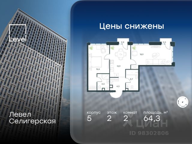 Цена указана с учётом скидки при 100%-й оплате, несубсидированной ипотеке, рассрочке (кроме программы "Рассрочка 0%"). В жилом квартале, расположенном в южной части района Западное Дегунино, продаётся 2-комнатная квартира площадью 62.50 кв.м без отделки. Квартира расположена на 7 этаже 40-этажного корпуса 5 в жилом комплексе комфорт-класса Левел Селигерская (компания Level Group/Левел групп). Отличная транспортная доступность: - 10 мин. пешком до станции метро "Верхние Лихоборы"; - 15 мин. пешком до станции метро "Селигерская"; - 20 мин. пешком до станции МЦД-3 "Моссельмаш"; - 11 мин. на авто до МКАД; - 13 мин. на авто до ТТК; - 16 мин. на авто до Садового кольца. Расположение Район отличается богатой социальной инфраструктурой: школы, детские сады, поликлиники, магазины, фитнес-клубы, торговые центры - всё близко к дому. Рядом с Левел Селигерская расположено 5 парковых зон. В 3 минутах от дома расположен перспективный сквер-парк. В 10 минутах пешком находится парк им. Святослава Фёдорова, в 13 минутах на велосипеде - парк "Ангарские пруды". В 7-11 минутах на автомобиле - два крупных природных объекта: Тимирязевский парк и Главный ботанический сад Российской академии наук. Благоустройство Внутренние дворы жилого комплекса огорожены от машин, а их функциональное наполнение отличается в зависимости от очереди строительства. На территории 2-й очереди жителей ждут уютные навесы с качелями, павильон-читальня, волейбольная площадка, беседки, а также детские и спортивные площадки. Технологии и инженерия Для входа на территорию комплекса предусмотрен единый ключ доступа. Все общественные зоны оснащены камерами видеонаблюдения, по заявке собственнику предоставляется возможность просмотра изображения отдельных видеокамер на его мобильном устройстве. При въезде в паркинг функционирует система распознавания госномеров. Кроме того, для комфорта жителей создано мобильное приложение, с помощью которого можно удаленно контролировать доступ на придомовую и жилую территории. Другие преимущества жилого комплекса - Высокая освещённость квартир: в большинстве из них не менее трёх окон; - Супермаркет, магазины, кафе, пекарни и многое другое на первых этажах домов; - Частный детский сад; - Стильные дизайнерские лобби с высокими потолками до 4,3 м. и окнами в пол, для питомцев предусмотрена лапомойка; - 30+ планировочных решений: от компактных студий до просторных семейных квартир; - С каждого этажа дома на лифте можно спуститься в подземный отапливаемый паркинг."