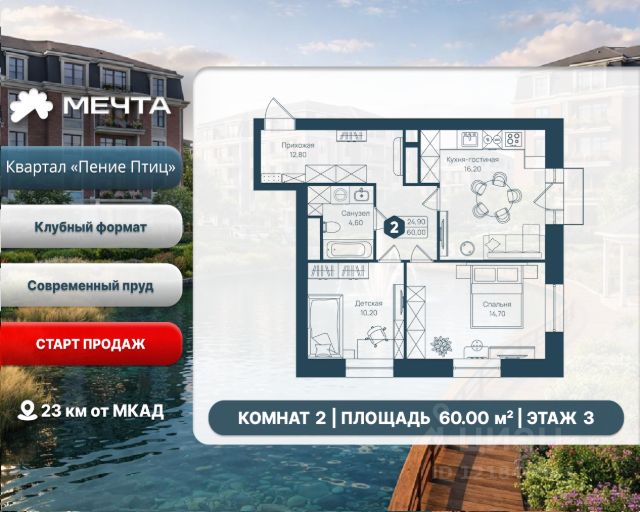 Рассрочка 0% от застройщика! Продается двухкомнатная квартира в квартале "Дружба" жилого комплекса "Мечта". Общая площадь квартиры: 59.54 кв. м, этаж 5 из 5. Срок сдачи: 4 квартал 2027 г. Отделка: Чернова ОСОБЕННОСТИ: - Просторная кухня-гостиная - Продуманная планировка - Широкоформатные окна - 2 спальни - 2 санузла - Высота потолка: 2.7 метра Квартал "Дружба" состоит из пяти пятиэтажных домов с несколькими подъездами. Каждый дом оборудован широкими окнами, которые обеспечивают максимальный доступ естественного света и открывают прекрасный вид на окружающую природу. Квартал отличается большими застеклёнными лоджиями, которые позволяют наслаждаться свежим воздухом и красивым видом, не покидая своего жилища. Жилой комплекс "Мечта" расположен в 23 км от МКАД по Дмитровскому или Ленинградскому шоссе. ТРАНСПОРТНАЯ ДОСТУПНОСТЬ: - 15-20 минут на общественном транспорте до МЦД-1 "Лобня" - 30-35 минут на общественном транспорте до метро "Физтех" - 45-50 минут до станций метро "Савеловская" или "Белорусская" - 30 минут на автомобиле до Москвы Инфраструктура включает в себя муниципальную школу и детские сады, кабинет врача общей практики, множество кафе и ресторанов, а также различные спортивные и детские площадки. В пешей доступности от жилого комплекса расположены лес и три реликтовых озера — Долгое, Круглое и Нерское, а также реки Альба, Уча и Волгуша. Территория жилого комплекса закрыта для посторонних, находится под охраной и патрулируется. На въезде расположен КПП. Камеры видеонаблюдения работают круглосуточно на всей территории. Вы и ваши дети будете чувствовать себя в безопасности.