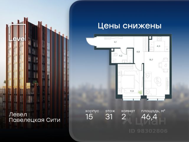 Цена указана с учётом скидки при 100%-й оплате, несубсидированной ипотеке, рассрочке (кроме программы "Рассрочка 0%"). В Даниловском районе столицы (ЮАО) продаётся 2-комнатная квартира площадью 42.70 кв.м без отделки. Квартира расположена на 2 этаже 27-этажного корпуса 14 в жилом комплексе бизнес-класса Левел Павелецкая Сити. Высота потолков 3.00м. Престижная локация Жилой комплекс бизнес-класса Левел Павелецкая Сити расположен в престижном Даниловском районе Москвы - историческом центре города в окружении парков, Москвы-реки и новейшей инфраструктуры. В 20 минутах пешком есть 3 станции метро, а в 5 минутах езды на авто - ТТК и Садовое кольцо. - 15 мин. пешком до метро "Павелецкая"; - 20 мин. пешком до станций "Тульская" и "Серпуховская"; - 8 мин. на авто до Кремля; - 10 мин. на авто до парка Горького и парка "Зарядье"; - 20 мин. на авто до башен "Москва-Сити". Авторская архитектура Авторская архитектура Авторская архитектурная концепция разработана бюро СПИЧ. Облик корпусов этапов 1 и 2 отсылает к стилистике архитектуры классического Нью-Йорка и золотой эпохи Голливуда. Корпуса этапа 4 вдохновлены эстетикой ар-деко. Умное линейное расположение корпусов гарантирует потрясающие виды на исторический центр и Москву-реку из большинства квартир. Дизайнерские лобби Изысканные интерьеры лобби жилого комплекса отсылают к классическим фильмам золотой эпохи Голливуда. Классика в жилом комплексе Левел Павелецкая Сити - не имитация, а современное осмысление лучшего в этом стиле. В каждом вестибюле оборудованы стойки ресепшен, комфортные зоны ожидания, гостевые санузлы, мойки для лап животных, колясочные. В корпусах по 3-4 лифта с прямым доступом в паркинг. Площадь лобби - от 47,9 до 114,9 кв. м, высота потолков - до 5,46 м. Благоустройство и инфраструктура Для создания благоустройства было приглашено 2 ведущих бюро - ADM и GAFA. Разноуровневое пространство вмещает в себя игровые площадки для детей всех возрастов, тропы здоровья для пеших прогулок, крытые аллеи с качелями, места для работы на свежем воздухе, многофункциональные спортивные площадки - зоны уличных тренировок, столы для пинг-понга, зоны командных игр. Общая площадь закрытого двора - 4,63 га. Комфорт - это когда рядом всё, что нужно для жизни. В жилом комплексе Левел Павелецкая Сити размещены 85 коммерческих помещений, где откроются супермаркеты, кафе, аптеки и многое другое. В составе проекта также предусмотрены собственный фитнес-клуб, развивающий центр Летово Кидс. Технологии и безопасность - Вайфай в лобби и на придомовой территории; - Автоматизированная система контроля и учета ресурсов; - Круглосуточное видеонаблюдение и охрана; - Круглосуточная связь с охраной через приложение, телефон или кол-центр; - Контроль доступа по биометрической системе распознавания лица; - Усиленный сотовый сигнал в лифтах и паркинге; - Распознавание номеров автомобилей при въезде/выезде в/из паркинга.