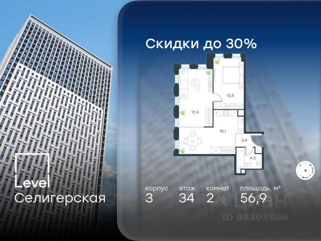 Цена указана с учётом скидки при 100%-й оплате, несубсидированной ипотеке, рассрочке (кроме программы "Рассрочка 0%"). В жилом квартале, расположенном в южной части района Западное Дегунино, продаётся 2-комнатная квартира площадью 47.70 кв.м без отделки. Квартира расположена на 31 этаже 40-этажного корпуса 3 в жилом комплексе комфорт-класса Level Селигерская (компания Level Group/Левел групп). Отличная транспортная доступность: - 10 мин. пешком до станции метро "Селигерская" от корпусов 1-й очереди; - 10 мин. пешком до станции метро "Верхние Лихоборы" от корпусов 2-й очереди; - 20 мин. пешком до станции МЦД-3 "Моссельмаш"; - 11 мин. на авто до МКАД; - 13 мин. на авто до ТТК; - 16 мин. на авто до Садового кольца. Расположение Район отличается богатой социальной инфраструктурой: школы, детские сады, поликлиники, магазины, фитнес-клубы, торговые центры - всё близко к дому. Рядом с Level Селигерская расположено 5 парковых зон. В 3 минутах от дома расположен перспективный сквер-парк. В 10 минутах пешком находится парк им. Святослава Фёдорова, в 13 минутах на велосипеде - парк "Ангарские пруды". В 7-11 минутах на автомобиле - два крупных природных объекта: Тимирязевский парк и Главный ботанический сад Российской академии наук. Благоустройство Внутренние дворы жилого комплекса огорожены от машин, а их функциональное наполнение отличается в зависимости от очереди строительства. На территории 1-й очереди будут: детская площадка, воркаут-зона, места для тихого отдыха и активных игр, а также сенсорный сад и большой луг. Во 2-й очереди жителей ждут уютные навесы с качелями, павильон-читальня, волейбольная площадка, беседки, а также детские и спортивные площадки. Технологии и инженерия Для входа на территорию комплекса предусмотрен единый ключ доступа. Все общественные зоны оснащены камерами видеонаблюдения, по заявке собственнику предоставляется возможность просмотра изображения отдельных видеокамер на его мобильном устройстве. При въезде в паркинг функционирует система распознавания госномеров. Кроме того, для комфорта жителей создано мобильное приложение, с помощью которого можно удаленно контролировать доступ на придомовую и жилую территории. Другие преимущества жилого комплекса - Высокая освещенность квартир: в большинстве из них не меньше трёх окон; - Супермаркет, магазины, кафе, пекарни и многое другое на первых этажах домов; - Частный детский сад; - Стильные дизайнерские лобби с высокими потолками до 4,9 м и окнами в пол, для питомцев предусмотрена лапомойка; - 20+ планировочных решений: от студий до семейных квартир; - С каждого этажа дома на лифте можно спуститься в подземный отапливаемый паркинг.