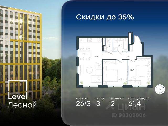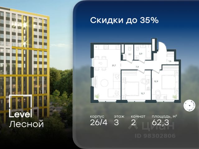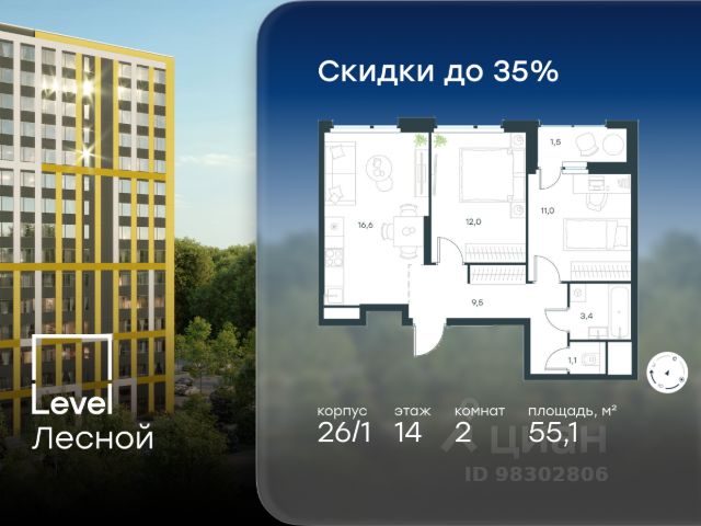 Цена указана с учётом скидки при 100%-й оплате, несубсидированной ипотеке, рассрочке (кроме программы "Рассрочка 0%"). В районе, утопающем в густой зелени лесов, многочисленных парков и скверов, продаётся 2-комнатная квартира площадью 61.40 кв.м с отделкой white box. Квартира расположена на 2 этаже в жилом комплексе комфорт-класса Level Лесной (компания Level Group/Левел групп). Отличная транспортная доступность: - 25 мин. пешком до станции метро "Пятницкое шоссе"; - 28 мин. на автобусе до станции метро и МЦД-2 "Волоколамская"; - 11 мин. на авто до МКАД; - 25 мин. на авто до ТТК. Продуманный архитектурный проект: - Концепция проекта Level Лесной от бюро СПИЧ; - Высотность комплекса до 15 этажей с уникальными видами на лесные массивы и город; - Высота потолков до 3 м; - Современные окна высотой до 1,6 м, в части квартир предусмотрены окна в пол. Высота подоконников 0,6 м; Расположение: Level Лесной строится в зелёной зоне ближайшего Подмосковья, г.о. Красногорск в посёлке Отрадное. Шаговая и автомобильная доступность до метро и больших транспортных артерий города. За 25 минут вы дойдёте до станции метро "Пятницкое шоссе", а за 20 минут на машине сможете доехать до станции метро "Тушинская". Район окружен роскошной зеленью лесов и парковых зон, занимающих территорию свыше 1 000 гектаров. Помимо благоприятной экологии, здесь множество возможностей для активного отдыха и поддержания физической формы. Облагороженная территории с полностью развитой инфраструктурой. На территории проекта находится детский сад и школа "Светлые Горы", которая входит в список лучших частных школ от Forbes Education (по данным на 2023г.). Кроме того, в пешей доступности расположено ещё 8 детских садов, а также запланировано открытие современной муниципальной школы. В непосредственной близости находятся сетевые супермаркеты и локальные магазины, аптеки, клиники, почта, библиотека, салоны красоты, рестораны, спортивные и творческие секции, развивающие детские центры. В 12 минутах пешком расположен торговый парк "Отрада" с продуктовым и строительным гипермаркетами, магазинами, кинотеатром и развлечениями для детей. Внутренняя инфраструктура: Мы знаем, как важно, чтобы магазины и сервисы были всегда рядом. В сданных корпусах Level Лесной уже расположена полностью готовая развитая инфраструктура. На первых этажах корпуса 27 предусмотрено ещё 14 коммерческих помещений. Благоустройство: Продуманное пространство и аура приватного европейского городка рождают чувство лёгкости и расслабления у каждого, кто попадает на территорию проекта. Концепцию общественных площадок разработали в партнёрстве два архитектурных бюро: Highlight Architecture и SCAPE. В безопасных дворах без машин каждый обязательно найдёт себе место для вдохновения, отдыха и спорта.