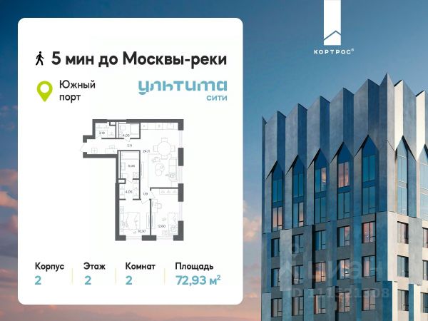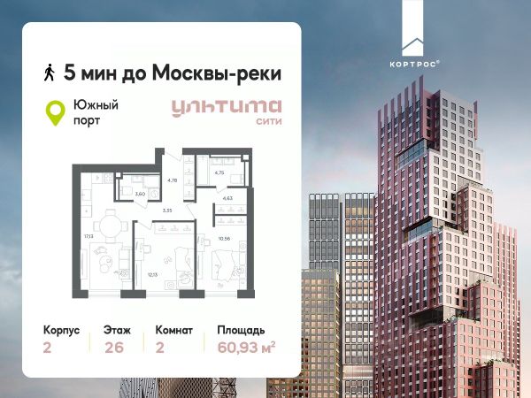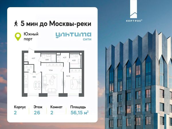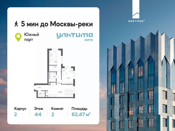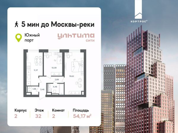 Предложение месяца от застройщика: - Скидка до 10% на ограниченный пул квартир - Рассрочка 0% на 1 год - Семейная ипотека без удорожания, ставка 4% - Ипотека для всех на весь срок, ставка 11,89% Продаётся 2-комнатная квартира от застройщика ГК "КОРТРОС" в жилом комплексе бизнес-класса УЛЬТИМА Сити. Квартира расположена на 7 этаже 52 этажного корпуса 2. Общая площадь 54,85 м². Без отделки. УЛЬТИМА Сити — жилой комплекс бизнес-класса в перспективном районе на юго-востоке Москвы. На его территории появятся 9 башен на 756 этажей, двухуровневый подземный паркинг, собственная инфраструктура, включая детский сад и школу. Всего девелопер благоустроит территорию в 2,6 га. Ближайшая станция метро — "Южный порт". Она откроется в 2028 году и будет находиться в 2-х минутах ходьбы. А прямо напротив расположится остановка водного автобуса-электрохода "Синичка". Дорога от квартала будет удобна и для автомобилистов: - до Кремля — 12 км - до МКАД — 12 км - до выезда на ТТК — 3 км - до Садового кольца — 8 км В двух корпусах первой очереди УЛЬТИМА Сити этажностью 45 и 52 реализуется 1 079 квартир с продуманными, рациональными планировочными решениями. В ассортиментной линейке представлены однокомнатные квартиры от 28,2 до 61 кв. м, двухкомнатные лоты от 44,3 до 95,4 кв. м, квартиры с тремя (71 — 115,57 кв. м) и четырьмя спальнями (106,6 — 114,97 кв. м). В экспозиции также есть квартиры с террасами, лоджиями, тремя и четырьмя санузлами, а также с функциональными нишами-кладовыми на кухнях. Запроектированы и эксклюзивные двухуровневые резиденции со вторым светом, в том числе с видом на Москву-реку, площадью от 77,7 до 141,9 кв. м. В рамках проекта запланировано строительство 9 корпусов, школы на 500 учащихся и детского сада на 225 мест. Еще будет создана продуманная инфраструктура для жителей: детские и спортивные площадки, амфитеатр для мероприятий, беседки и теплицы для садоводства, коворкинг, детский клуб и ресторан с открытой террасой. Доступ в жилой комплекс осуществляется по биометрическому контролю. Вокруг квартала будет приватная территория с видеонаблюдением и консьерж-сервисом 24/7. Лобби корпусов будут иметь двойные выходы: на улицу и во внутренний закрытый двор.