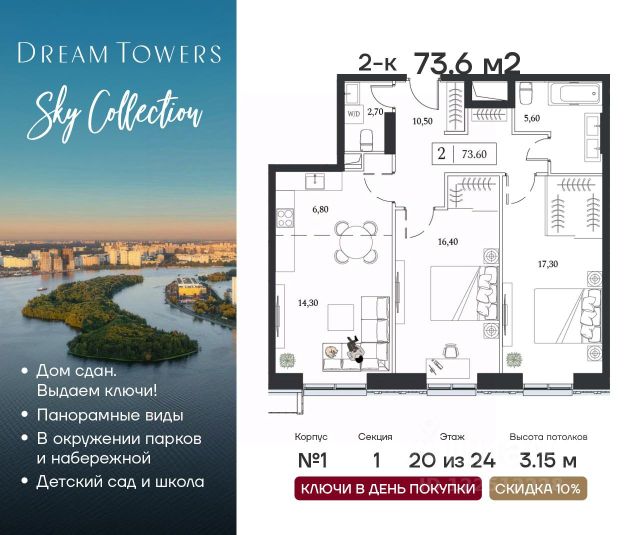 Рассрочка 0% от застройщика. Ключи в день покупки. ЖК Dream Towers проект премиум-класса в окружении парков и набережной, с полностью готовой инфраструктурой для комфортной жизни и отдыха. Продаётся 2-квартира на 6 этаже 6-этажного дома (3 корпус). Общая площадь: 57.1 кв.м. Высота потолков от 3.50 м. Город-курорт на 100 Га в шаге от вашего дома: - пляжный комлекс Dream Beach Club; - парк аттракционов Остров Мечты; - 44 Га ландшафтных парков; - пешеходная набережная; - яхт-клуб; - Южный речной вокзал; - вейк-парк и многое другое. В Dream Towers предусмотрено все для комфортной жизни с семьей: - дизайнерские лобби с общественной гостиной, колясочной и лапомойками; - охраняемый благоустроенной двор только для жителей; - собственный десткий сад и школа прямо во дворе; - красивая архитектура зданий в стиле Ар-деко; - облицовка фасадов из натурального камня с архитектурной подсветкой; - широкоформатное остекление окон в пол для лучших видовых характеристик на парки и пойму Москвы-реки; - подземный паркинг; - клубный формат проживания; - эргономичные планировки от 40 до 162 м2; - высокие потолки от 3,15 до 4,1 м; - квартиры с террасами; - вся необходимая инфраструктура на первых этажах домов, а также в торговой части тематического парка "Остров Мечты" (рестораны, кафе, супермаркет, магазины, салон красоты, йога-студия и многое другое). Центр рядом: 15 минут до Садового кольца на авто, 20 минут до Сити или Кремля. В 5 минутах прогулочным шагом — станция метро "Технопарк".