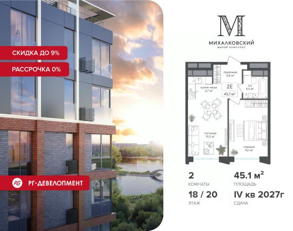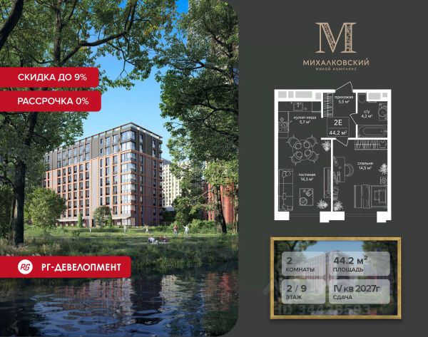 При приобретении квартиры доступна беспроцентная рассрочка с первым платежом от 30%. У покупателя также есть право воспользоваться скидкой в размере 5% от полной стоимости квартиры. - Первый платеж составляет 30% от стоимости объекта и вносится при заключении ДДУ - Второй платеж в размере 30% от стоимости объекта вносится через 6 месяцев с даты заключения ДДУ - Остаток 20% через 12 месяцев с даты заключения ДДУ, но не позднее 30.06.2027 - Остаток 20% не позднее 30.06.2027 - Действует на приобретение квартир в корп. 2, 7 Продаётся 2-к квартира 41,9 кв.м. в ЖК "Михалковский" на 7-м этаже 20 этажного дома. Скидка 9% при покупке квартиры! Ипотека для каждого! Полная стоимость кредита от 12,380% до 18,537%. Ставка от 0,11% в АО "Альфа-Банк", ген. лицензия ЦБ РФ 1326 от 16.01.2015. Ставка фиксируется на первые 12 месяцев, далее полная стоимость кредита от 22,022% до 24,599% ставка 21,59%. Первоначальный взнос — от 20,1% от стоимости квартиры. Срок кредитования — от 4 до 30 лет. Компания "РГ-Девелопмент" предоставляет скидку на квартиры в жилом комплексе. Акция действительна до 31.03.2026 включительно. Для того чтобы воспользоваться предложением, необходимо подписать договор на приобретение недвижимости до 31.03.2026 включительно. Действует программа "Растет семья - растет и квартира". Компания "РГ-Девелопмент" вошла в ТОП-10 девелоперов по объёму введённого жилья в "Старой Москве" по итогам 2025 года. Прямая продажа от застройщика! Квартиры без отделки. Срок сдачи IV кв. 2027г. Особенности проекта: Завораживающие виды Красивое благоустройство Уникальная локация для Москвы (рядом Головинский парк, пруды, усадьба Михалково) Рядом с центром В проекте присутствует: архитектура голландского бюро MLA+, зеленые зоны, транспортная доступность, благоустроенная территория, подземный паркинг, детский сад и выход на Головинский парк с пятью прудами. Название комплекса указывает на одну из его черт - соседство с имением Михалково. Позвольте себе жить в месте, где проводили свой досуг династии Дашковых и Паниных.