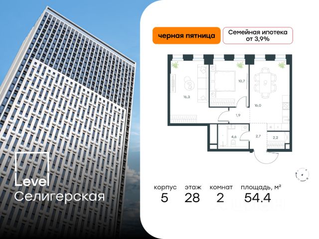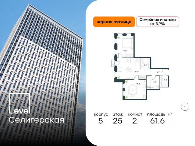 Цена указана с учётом скидки при 100%-й оплате, несубсидированной ипотеке, рассрочке (кроме программы "Рассрочка 0%"). Субсидированная семейная ипотека. Полная стоимость кредита 20,963 - 23,237% годовых. Ставка 3,9% годовых. Первоначальный взнос от 20,01%. Сумма кредита до 12 млн. руб. В жилом квартале, расположенном в южной части района Западное Дегунино, продаётся 2-комнатная квартира площадью 55.50 кв.м без отделки. Квартира расположена на 8 этаже 40-этажного корпуса Корпус 5 в жилом комплексе комфорт-класса Level Селигерская (компания Level Group/Левел групп). Отличная транспортная доступность: - 10 мин. пешком до станции метро "Селигерская" от корпусов 1-й очереди; - 10 мин. пешком до станции метро "Верхние Лихоборы" от корпусов 2-й очереди; - 20 мин. пешком до станции МЦД-3 "Моссельмаш"; - 11 мин. на авто до МКАД; - 13 мин. на авто до ТТК; - 16 мин. на авто до Садового кольца. Расположение Район отличается богатой социальной инфраструктурой: школы, детские сады, поликлиники, магазины, фитнес-клубы, торговые центры - всё близко к дому. Рядом с Level Селигерская расположено 5 парковых зон. В 3 минутах от дома расположен перспективный сквер-парк. В 10 минутах пешком находится парк им. Святослава Фёдорова, в 13 минутах на велосипеде - парк "Ангарские пруды". В 7-11 минутах на автомобиле - два крупных природных объекта: Тимирязевский парк и Главный ботанический сад Российской академии наук. Благоустройство Внутренние дворы жилого комплекса огорожены от машин, а их функциональное наполнение отличается в зависимости от очереди строительства. На территории 1-й очереди будут: детская площадка, воркаут-зона, места для тихого отдыха и активных игр, а также сенсорный сад и большой луг. Во 2-й очереди жителей ждут уютные навесы с качелями, павильон-читальня, волейбольная площадка, беседки, а также детские и спортивные площадки. Технологии и инженерия Для входа на территорию комплекса предусмотрен единый ключ доступа. Все общественные зоны оснащены камерами видеонаблюдения, по заявке собственнику предоставляется возможность просмотра изображения отдельных видеокамер на его мобильном устройстве. При въезде в паркинг функционирует система распознавания госномеров. Кроме того, для комфорта жителей создано мобильное приложение, с помощью которого можно удаленно контролировать доступ на придомовую и жилую территории. Другие преимущества жилого комплекса - Высокая освещенность квартир: в большинстве из них не меньше трёх окон; - Супермаркет, магазины, кафе, пекарни и многое другое на первых этажах домов; - Частный детский сад; - Стильные дизайнерские лобби с высокими потолками до 4,9 м и окнами в пол, для питомцев предусмотрена лапомойка; - 20+ планировочных решений: от студий до семейных квартир; - С каждого этажа дома на лифте можно спуститься в подземный отапливаемый паркинг.