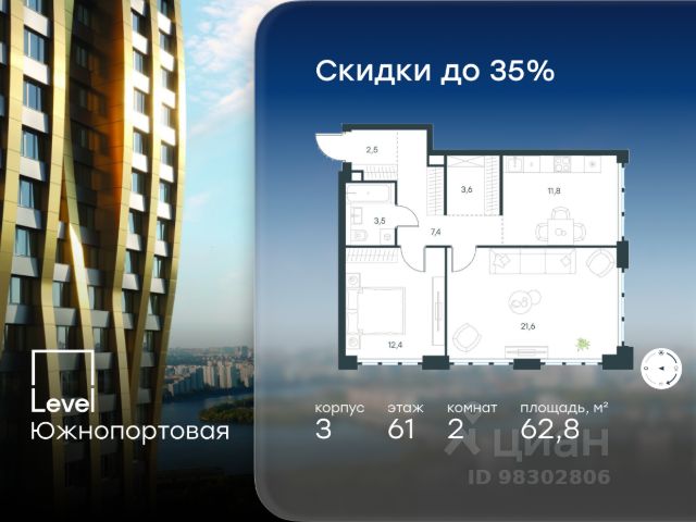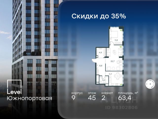 Цена указана с учётом скидки при 100%-й оплате, несубсидированной ипотеке, рассрочке (кроме программы "Рассрочка 0%"). В северной части района Печатники продается 2-комнатная квартира площадью 52.10 кв.м с отделкой white box. Квартира расположена на 10 этаже 49-этажного корпуса 9 в жилом комплексе комфорт-класса Level Южнопортовая (компания Level Group/Левел групп). Отличная транспортная доступность: - 10 мин. пешком до станции метро "Кожуховская"; - 20 мин. пешком до станции МЦК "Дубровка"; - 3 мин. на авто до ТТК; - 13 мин. на авто до Садового кольца; - 15 мин. на авто до Бульварного кольца. Продуманный архитектурный проект: - авторская архитектура от бюро СПИЧ; - уникальные виды на реку, парки и достопримечательности города; - высота потолков в квартирах до 6 м; - окна высотой до 1,87 м с высоким коэффициентом сопротивления теплоотдаче. Расположение: Level Южнопортовая строится в северной части района Печатники - самой приближенной к центру. Здесь будет сформирован новый район "Южный порт", где построят крупный жилой и общественно-деловой центр, аналогичный Москва-Сити. В течение 10-12 лет в этом месте появятся не только жилые дома, но и развитая инфраструктура для жизни и работы. А еще совсем рядом находится набережная Москвы-реки, где планируется построить причалы для речных трамвайчиков и канатную дорогу. Уже сейчас вокруг жилого комплекса работают десятки магазинов и торговых центров, рядом расположено 6 парков, среди которых музей-заповедник "Коломенское". В 10 минутах пешком - 2 муниципальных и 2 частных детских сада, 7 общеобразовательных школ. Внутренняя инфраструктура: Для отдыха жителей в каждом корпусе предусмотрено лобби, оснащенное местами для отдыха, гостевыми санузлами и лапомойками, а в отдельных корпусах - камином. За счёт больших окон и высоких потолков пространства будут наполнены воздухом и светом. На первых этажах жилого комплекса откроются магазины, салоны красоты, фитнес-центр. Для детей строятся собственные детский сад и школа. Благоустройство: Внутренний двор комплекса разработан совместно с бюро GAFA. Основная идея - создать аналог Центрального парка в Нью-Йорке, гармонично сочетая высотные здания и большое изолированное парковое пространство. Вся площадь двора-парка будет огорожена и составит более 2 га, из которых 45% - озеленение. Одним из самых важных ландшафтных элементов здесь станет небольшая речка, наполняющаяся во время дождя. Вокруг неё появится сеть из островов, внутри которых расположатся тематические зоны спорта и отдыха. Технологии и инженерия: - автоматическая передача в управляющую компанию показаний квартирных счётчиков; - телефонная связь, телевидение и интернет на базе оптической мультисервисной сети; - гостевой Wi-Fi в лобби и на территории двора; - единый ключ доступа для входа на территорию комплекса.