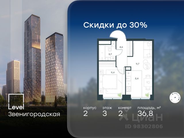 Цена указана с учётом скидки при 100%-й оплате, несубсидированной ипотеке, рассрочке (кроме программы "Рассрочка 0%"). В жилом квартале продаётся 2-комнатная квартира площадью 47.50 кв.м white box. Квартира расположена на 16 этаже 48 этажного корпуса 1 в жилом комплексе комфорт класса Level Звенигородская (компания Level Group/Левел групп). Отличная транспортная доступность - 5 мин. пешком до метро "Звенигородская" (откроется к окончанию строительства); - 18 мин. пешком до станции МЦК "Хорошёво" и станции БКЛ "Народное ополчение"; - 4 мин. на авто до ТТК; - 8 мин. на авто до Садового кольца; - 15 мин. на авто до Кремля. Продуманный архитектурный проект - Концепция от студии Станислава Михаловского, в основу которой легло единение природы и города; - Двухкамерные стеклопакеты в окнах, алюминиевый и ПВХ профиль - в квартирах тепло зимой и прохладно летом; - С верхних этажей откроются панорамные виды на город, Москву-реку, "Москва-Сити" и Москворецкий парк; - Лобби со всеми удобствами: окна в пол, высокие потолки до 4,7 м, лаунж-зоны, колясочные, гостевые санузлы и мойки для лап животных; - Централизованные водонагреватели гарантируют круглогодичную подачу горячей воды в каждую квартиру. Благоустройство Концепция благоустройства разработана совместно с бюро UNK landscape. Высота башен приближается к 200 метрам - они словно касаются неба. Небесный простор проецируется на территорию двора с помощью подсветки, визуально увеличивая пространство и отражаясь в авторских элементах архитектуры. На территории площадью 0,45 га расположатся: - "Облако событий" - место встреч и общения; - "Облако спорта" - всё для поддержания себя в форме; - "Облако принятия решений" - пространство для работы на свежем воздухе; - "Облако спокойствия" - для отдыха в тишине природы; - "Облако игр" - площадки для подростков и самых маленьких. Инфраструктура В жилом комплексе откроется 21 коммерческое помещение: продуктовые лавки, кафе, салоны красоты, службы доставки и творческие студии. Этап 1 включает строительство двухуровневого подземного паркинга. Всего здесь расположится 351 машино-место, включая семейные места, и 264 кладовых помещения. В распоряжении жителей развитая инфраструктура района: 15 супермаркетов, 5 спортивных объектов, 9 медучреждений, 7 детских садов, 4 школы, 3 благоустроенных парка - всё в шаговой доступности. Инженерия Комфортное перемещение внутри домов будут обеспечивать надёжные лифты с доступом в паркинг с жилых этажей. В каждом корпусе предусмотрено до шести кабин, включая сервисные лифты. Попасть на территорию комплекса можно только по единому ключу доступа. Видеонаблюдение установлено на входах в подъезды, в лобби, в общих зонах, на въезде в паркинг. Гости смогут связаться с жителями дома через входные видеопанели, а управлять доступом на территорию можно через видеодомофон или приложение на телефоне.