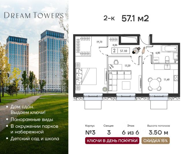 Рассрочка 0% от застройщика. Ключи в день покупки. ЖК Dream Towers проект премиум-класса в окружении парков и набережной, с полностью готовой инфраструктурой для комфортной жизни и отдыха. Продаётся 2-квартира на 15 этаже 24-этажного дома (1 корпус). Общая площадь: 73.6 кв.м. Высота потолков от 3.15 м. Город-курорт на 100 Га в шаге от вашего дома: - пляжный комлекс Dream Beach Club; - парк аттракционов Остров Мечты; - 44 Га ландшафтных парков; - пешеходная набережная; - яхт-клуб; - Южный речной вокзал; - вейк-парк и многое другое. В Dream Towers предусмотрено все для комфортной жизни с семьей: - дизайнерские лобби с общественной гостиной, колясочной и лапомойками; - охраняемый благоустроенной двор только для жителей; - собственный десткий сад и школа прямо во дворе; - красивая архитектура зданий в стиле Ар-деко; - облицовка фасадов из натурального камня с архитектурной подсветкой; - широкоформатное остекление окон в пол для лучших видовых характеристик на парки и пойму Москвы-реки; - подземный паркинг; - клубный формат проживания; - эргономичные планировки от 40 до 162 м2; - высокие потолки от 3,15 до 4,1 м; - квартиры с террасами; - вся необходимая инфраструктура на первых этажах домов, а также в торговой части тематического парка "Остров Мечты" (рестораны, кафе, супермаркет, магазины, салон красоты, йога-студия и многое другое). Центр рядом: 15 минут до Садового кольца на авто, 20 минут до Сити или Кремля. В 5 минутах прогулочным шагом — станция метро "Технопарк".