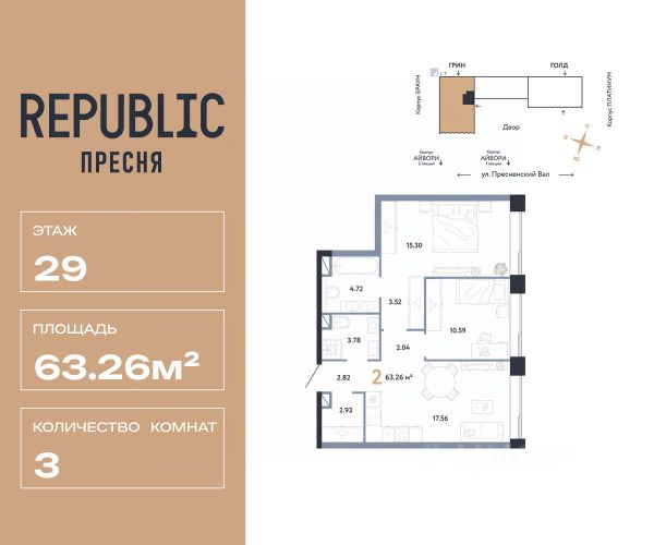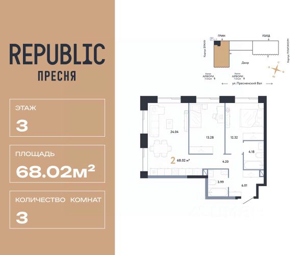 Рассрочка 0% с первым взносом от 20%, ипотека с субсидией или наличные. Подберём способ оплаты индивидуально. Продается 3комнатная квартира на 2 этаже от застройщика Страна Девелопмент. Площадь квартиры 65.68 кв. м. Дизайн-квартал "Republic" — новый проект премиум-класса в Москве от федерального застройщика "Страна Девелопмент". ЦАО, Пресня, 7 мин. от метро "Белорусская". 10 жилых башен и 4 восстановленных здания локомотивного депо образуют уникальное пространство. "Republic" — место, где вы ощутите гармонию истории и современности. За 12 мин. вы сможете дойти до Московского зоопарка, за 10 мин. на авто доехать до Патриарших прудов и Белого дома. Преимущества • Благоустройство. SPA-комплекс с бассейном и термами, гастрономический, учебный и шопинг-центры, приватный бульвар и яркие арт-пространства — для жителей предусмотрены все элементы премиального комфорта. • Панорама на центр. Наслаждайтесь видами ЦАО каждый день: панорама на историческую Пресню и башни Москва-Сити — из своей квартиры или с приватной террасы на крыше. • Концептуальное лобби в каждой башне. С общей террасой на кровле, с библиотекой, коворкингом и фитнес-рум. Стойка консьержа перетекающая в бар и др. • Современные форматы квартир. Свободные планировки, с террасой или балконом, с возможностью установки камина, от 1-комнатных до пентхаусов. Отделка Квартиры сдаются без отделки или в формате White box. При White box уже выполнены все шумные и грязные работы: произведена разводка электричества с подрозетниками, установлены откосы из гипсокартона, устроена стяжка пола с шумоизоляцией и др. Способы покупки Сотрудники "Страна Девелопмент" будут сопровождать вас на каждом этапе сделки, помогут получить одобрение по ипотеке или снизить ежемесячный платеж. - ипотека (стандартная/с субсидией/траншевая) - рассрочка (с ПВ от 20%) - с использованием материнского капитала - оплата наличными