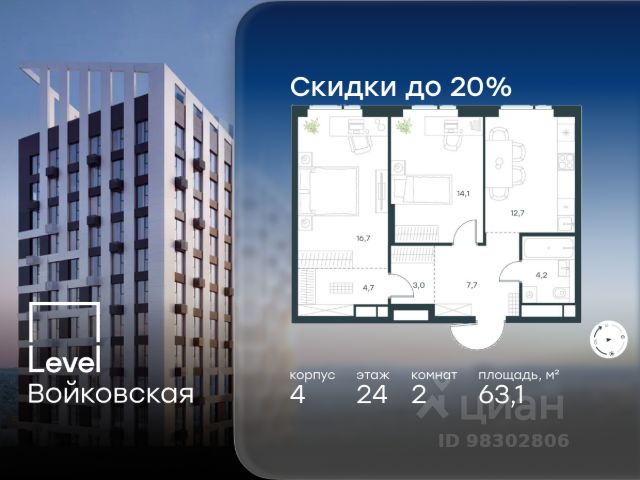 Цена указана с учётом скидки при 100%-й оплате, несубсидированной ипотеке, рассрочке (кроме программы "Рассрочка 0%"). Продается 2-комнатная квартира площадью 63.70 кв. м без отделки. Квартира находится на 14 этаже 20-этажного корпуса 3, в новом жилом комплексе бизнес-класса Level Войковская, расположенном рядом с живописным заповедником "Покровское-Стрешнево" (застройщик - компания Level Group/Левел групп). Прекрасная транспортная доступность - 7 мин. пешком до станции МЦК "Балтийская"; - 15 мин. пешком до станции метро "Войковская"; - 8 мин. на машине до ТТК; - 15 мин. на машине до центра Москвы; - 20 мин. на машине до Москва-Сити. Продуманный архитектурный проект - стильная архитектура от мастерской Фефелова В. В.; - панорамные виды на парки, Химкинское водохранилище и Останкинскую башню; - лобби с высотой потолков до 6,45 метров; - более 20 видов планировочных решений, включая редкие форматы квартир с террасой и увеличенной высотой потолков до 5,42 метров; - 2 варианта дизайнерской отделки в корпусе 4, предлагаются как дополнительная опция к отделке white box: стиль Modern в светлых холодных тонах и стиль Classic в нейтральной бежевой гамме. Квартиры в корпусах 3 и 5 сдаются без отделки. Расположение Level Войковская строится в престижном Северном округе Москвы. Развитая инфраструктура и живописная природа переплетаются в единый ансамбль, столь значимый для комфортной жизни. Войковский район окружают парки и набережные. В шаговой доступности - парк "Покровское-Стрешнево", не более 15-ти минут на велосипеде занимает путь до Тимирязевского парка и 9-ти минут до парка усадьбы Михалково. Рядом более 60 школ, 75 дошкольных учреждений, 17 государственных и 6 частных вузов, 25 супермаркетов, 4 торговых центра, среди которых ТЦ "Метрополис" и ТЦ "Авиапарк". Внутренняя инфраструктура На территории жилого комплекса предусмотрены коммерческие помещения: кафе, ресторан, пекарня и другие сервисы откроются на первых этажах корпусов. Для жителей будет доступен отапливаемый подземный паркинг на 244 машино-места с доступом с любого этажа на лифте. На территории паркинга будет расположено 125 кладовых помещений для хранения сезонного инвентаря. Лобби и благоустройство Дизайн лобби Level Войковская создан совместно с бюро BLANK. Это уютные гостиные, где хочется задержаться. Теплая цветовая гамма, ресепшен, зоны ожидания, лапомойки и гостевые санузлы - каждая деталь превращает лобби в комфортное продолжение вашего дома. 1,15 га площади в первых двух этапах строительства отведено под приватный внутренний двор, который спроектирован совместно с бюро "Правда". Детские площадки для всех возрастов, спортивные пространства для йоги, воркаута и петанка, уютные зоны для тихого отдыха или работы. Здесь утро начинается с вдохновения, а вечер наполнен приятными моментами. Лифты Комфортное перемещение внутри жилого комплекса будут обеспечивать надёжные лифты с доступом в паркинг с жилых этажей. В каждом корпусе предусмотрено по 3 грузопассажирских лифта.