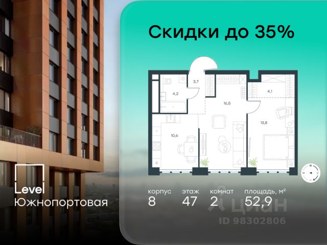 Цена указана с учётом скидки при 100%-й оплате, несубсидированной ипотеке, рассрочке (кроме программы "Рассрочка 0%"). В северной части района Печатники продается 2-комнатная квартира площадью 57.30 кв.м без отделки. Квартира расположена на 2 этаже 16-этажного корпуса 11 в жилом комплексе комфорт-класса Level Южнопортовая (компания Level Group/Левел групп). Отличная транспортная доступность: - 10 мин. пешком до станции метро "Кожуховская"; - 20 мин. пешком до станции МЦК "Дубровка"; - 3 мин. на авто до ТТК; - 13 мин. на авто до Садового кольца; - 15 мин. на авто до Бульварного кольца. Продуманный архитектурный проект: - авторская архитектура от бюро СПИЧ; - уникальные виды на реку, парки и достопримечательности города; - высота потолков в квартирах до 6 м; - окна высотой до 1,87 м с высоким коэффициентом сопротивления теплоотдаче. Расположение: Level Южнопортовая строится в северной части района Печатники - самой приближенной к центру. Здесь будет сформирован новый район "Южный порт", где построят крупный жилой и общественно-деловой центр, аналогичный Москва-Сити. В течение 10-12 лет в этом месте появятся не только жилые дома, но и развитая инфраструктура для жизни и работы. А еще совсем рядом находится набережная Москвы-реки, где планируется построить причалы для речных трамвайчиков и канатную дорогу. Уже сейчас вокруг жилого комплекса работают десятки магазинов и торговых центров, рядом расположено 6 парков, среди которых музей-заповедник "Коломенское". В 10 минутах пешком - 2 муниципальных и 2 частных детских сада, 7 общеобразовательных школ. Внутренняя инфраструктура: Для отдыха жителей в каждом корпусе предусмотрено лобби, оснащенное местами для отдыха, гостевыми санузлами и лапомойками, а в отдельных корпусах - камином. За счёт больших окон и высоких потолков пространства будут наполнены воздухом и светом. На первых этажах жилого комплекса откроются магазины, салоны красоты, фитнес-центр. Для детей строятся собственные детский сад и школа. Благоустройство: Внутренний двор комплекса разработан совместно с бюро GAFA. Основная идея - создать аналог Центрального парка в Нью-Йорке, гармонично сочетая высотные здания и большое изолированное парковое пространство. Вся площадь двора-парка будет огорожена и составит более 2 га, из которых 45% - озеленение. Одним из самых важных ландшафтных элементов здесь станет небольшая речка, наполняющаяся во время дождя. Вокруг неё появится сеть из островов, внутри которых расположатся тематические зоны спорта и отдыха. Технологии и инженерия: - автоматическая передача в управляющую компанию показаний квартирных счётчиков; - телефонная связь, телевидение и интернет на базе оптической мультисервисной сети; - гостевой Wi-Fi в лобби и на территории двора; - единый ключ доступа для входа на территорию комплекса.