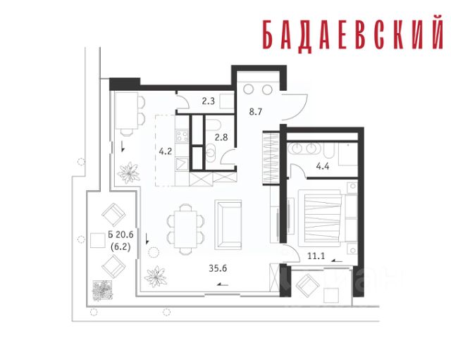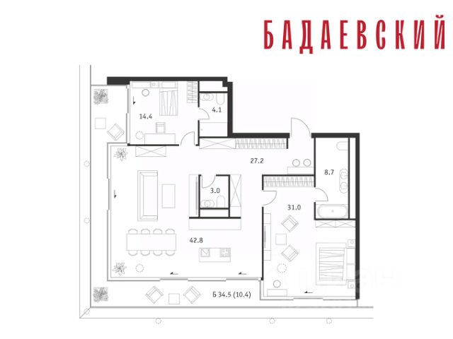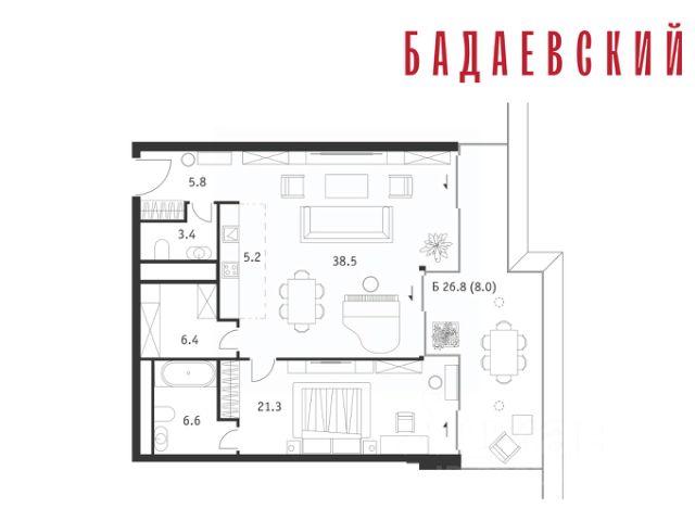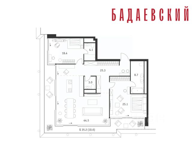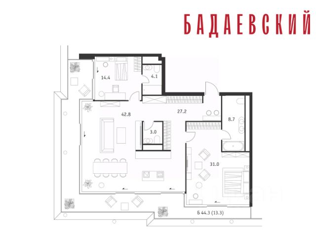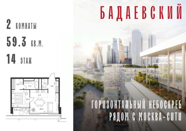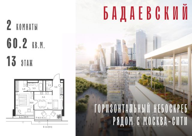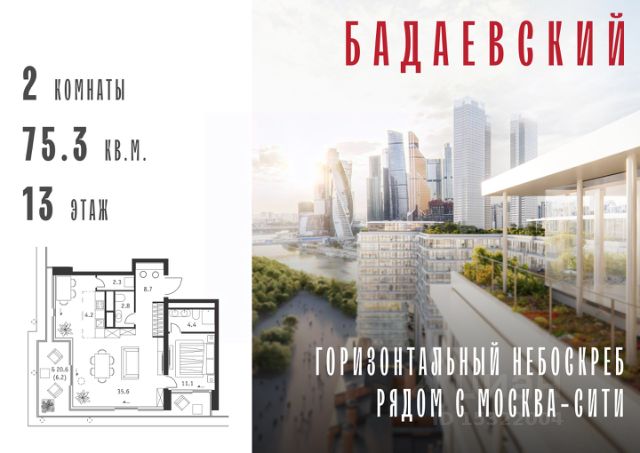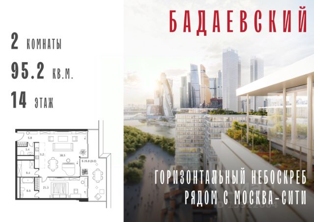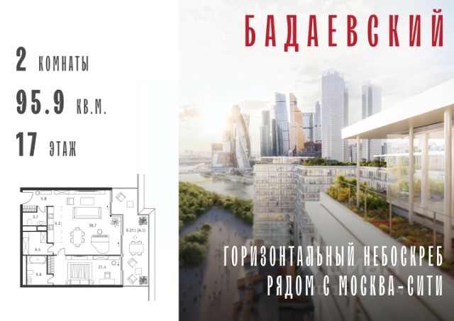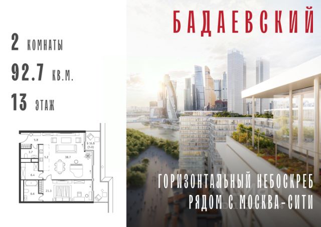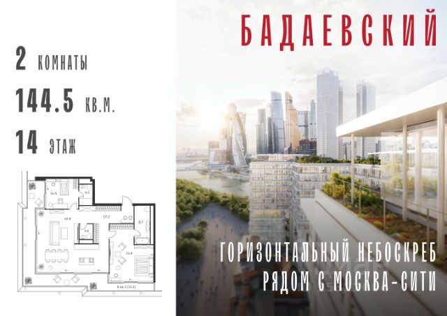 Продаётся 2-комнатная квартира общей площадью 139.70 м² на 13 этаже Жилого Комплекса Бадаевский. О нем говорили. Его ждали. Жилой комплекс "Бадаевский" на Кутузовском проспекте — это место для жизни, которое займет место в истории. Комплекс стал первым в истории московским проектом, победившим в категории Residential на World Architecture Festival. Девелопер Capital Group. В "Бадаевском" исторические здания завода и футуристические "парящие" дома создают единый комплекс, который станет новой достопримечательностью и символом Москвы. Панорамное остекление, террасы и веранды дарят неординарные и захватывающие виды. Благодаря расположению домов и панорамному остеклению, жилые пространства в "Бадаевском" будут наполнены светом. А виды из окон домов-"лент" на Москву-реку, пивоваренный завод, небоскребы "Москва-Сити" и Белый дом дополнены принципиально новым ощущением высоты. На территории Бадаевского завода появится масштабный ландшафтный парк с концепцией "русский лес". Впервые в истории района Дорогомилово у жителей появится прямая связь набережной Тараса Шевченко с Кутузовским проспектом. Близость Москвы-реки добавляет к преимуществам "Бадаевского" природную энергетику и приятные прогулки на свежем воздухе. Подземная парковка позволит сделать территорию завода полностью пешеходной, а сам комплекс представит новый подход к организации открытого и уединенного пространства в центре Москвы. Расположение в начале Кутузовского проспекта делает проект не только престижным, но и удобным: до Третьего транспортного и Садового кольца можно доехать за 5 минут, а Кремль и основные исторические достопримечательности расположены в 15 минутах на автомобиле. Напротив "Бадаевского" находится офисный кластер "Москва-Сити". Для жителей комплекс будет создано не только новое масштабное благоустройство, но и вся необходимая инфраструктура. В исторических корпусах появятся магазины, бутики, кафе и рестораны, коворкинг и крафтовая пивоварня, а в зданиях элеваторов — русская баня. Кроме того, запланирован фермерский рынок и досуговый кластер с музыкальной студией, центром детского творчества и фитнес-центром с бассейном.