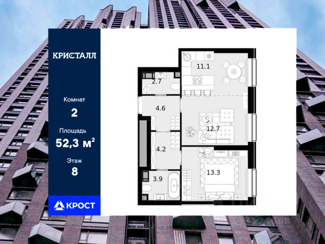 Двухкомнатная квартира площадью 52,3 кв.м. на 8 этаже дома бизнес-класса "Трилогия Кристалл". Жилой комплекс Трилогия Кристалл комфорт в сердце Хорошево-Мнёвников. Удобное расположение и транспортная доступность. Трилогия Кристалл расположен в престижном районе Хорошево-Мнёвники, на улице Генерала Глаголева, всего в нескольких минутах от живописного Серебряного бора и набережной Москвы-реки. Из окон открываются панорамные виды на воду и зелёные зоны, создавая ощущение гармонии с природой. Автомобильная доступность • Звенигородское шоссе и проспект Маршала Жукова быстрый выезд в любую часть города. • 7 км до ТТК, 9 км до МКАД, 10 км до Садового кольца. • Общественный транспорт: • Ближайшая станция метро "Народное ополчение" (2 км). Добраться можно пешком или на автобусе. • В пешей доступности строятся 3 новые станции метро, что повысит транспортную связанность района. Инфраструктура: всё для жизни в шаговой доступности Комплекс входит в состав масштабного квартала Юнион Парк (40 га) это современная городская среда с продуманной инфраструктурой. Образование и развитие: • Лучшие школы Москвы: 1515, 1517, 138, Курчатовская школа. • Детские сады. • Музыкальная школа им. В. В. Андреева. Медицина и спорт: • Поликлиника "Семейный доктор", медцентр "Мед-Лайт", стоматология. • Спорткомплекс "Серебряный" с бассейном, тренажерным залом и солярием. Магазины и рестораны: • Премиальные магазины: "Азбука вкуса", "ВкусВилл", "Лента", "Магнолия". • Рестораны и кафе. Футуристичная архитектура с продуманным комфортом Трилогия Кристалл это уникальный дизайн и эргономичные планировки: Внешний облик: • Кристаллическая архитектура с панорамными эркерами и фасадами в оттенках горького шоколада. • Трехуровневая структура, где на верхнем ярусе вы увидите геометрические эркеры с панорамным остеклением, на среднем уровне расположены квартиры с окнами на 1-2 стороны, а на нижнем отделка австрийским клинкерным кирпичом. Внутреннее пространство: • Светлые входные группы с лаунж-зонами для отдыха и мероприятий. • Подземный паркинг (по машиноместу на квартиру) и кладовые для хранения. • Закрытые дворы с спортивными зонами: • Теннисный корт. • Площадки для воркаута. • Беговые дорожки. • Поле для игровых видов спорта. Квартиры с продуманными планировками • 14 комнатные варианты. • Высокие потолки и панорамное остекление для максимальной инсоляции. • Ровные стены и черновая/чистовая отделка на выбор. • Готовые решения для комфортного заезда.