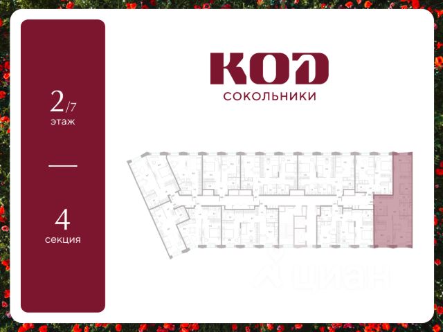 В семейном жилом квартале, расположенном в окружении более 500 га леса и объектов исторического наследия, продается 2-комнатная квартира площадью 75.9 кв. м без отделки. Квартира расположена на 10 этаже 39-этажного корпуса 2.2 жилого квартала бизнес-класса КОД Сокольники от девелопера Новая Эра. Отличная транспортная доступность - 3 мин. пешком до станции МЦД-3 "Митьково"; - 7 мин. пешком до станции метро "Сокольники"; - Удобный выезд на Русаковскую улицу; - 5 мин. на авто до ТТК; - 15 мин. на авто до Садового кольца. Продуманный архитектурный проект - Выразительная архитектура, созданная бюро "Остоженка"; - 70% квартир в квартале - видовые, что позволяет ежедневно наслаждаться панорамами на парк Сокольники, Останкинскую телебашню, исторический центр и Алексеевский монастырь; - 30% квартир - угловые. Увеличенные оконные проемы, панорамное остекление и продуманное расположение комнат усиливают эффект обзорности: гостиные и спальни получают максимум дневного света и живописные виды, которые становятся частью интерьера; - Высокие потолки от 3 метров в типовых планировках; - Дизайнерские лобби от модной студии 211.Studio; - Двухуровневый паркинг с подогреваемой рампой и пологим заездом, подходящим даже для спорткаров; Расположение Семейный жилой квартал КОД Сокольники - это дома бизнес-класса в престижном районе Сокольники. Район отличает хорошая транспортная доступность: несколько минут пешком до станции метро "Сокольники" и платформы МЦД-3 ("Митьково"), регулярные трамвайные и автобусные маршруты, удобный выезд на Русаковскую улицу и Третье транспортное кольцо. До Садового кольца можно доехать за 15 минут. Для пешеходов и велосипедистов в парковой зоне будут оборудованы широкие тротуары и велодорожки, обеспечивая комфортные условия для активного образа жизни. Внутренняя инфраструктура Резидентам будет доступна развитая клубная инфраструктура: собственный фитнес-рум, коворкинг с панорамным видом на парк, игровая комната для детей, пространства для мастер-классов и просторная гостиная, которую можно использовать для отдыха, просмотра кино или проведения мероприятий. На первых этажах жилых домов разместятся объекты стрит-ритейла: кафе, рестораны, магазины и различные сервисы - от аптек и салонов красоты до ателье и барбершопов. Рядом с жилыми корпусами появится деловой квартал с офисами и торговыми площадями на 75 тысяч кв. м, что делает проект привлекательным для тех, кто ценит возможность жить и работать поблизости. Благоустройство Центральным элементом квартала станет благоустроенный двор-парк площадью 3 га с собственным прудом и зелеными зонами для прогулок и отдыха. В границах двора предусмотрены современные игровые и спортивные площадки: мультифункциональная зона воркаута, площадки для волейбола и стритбола, площадки для пилатеса и йоги, скалодром, а также беговые и веломаршруты. В состав проекта войдет образовательный центр, включающий детский сад для 350 малышей, а также школу на 650 учеников.