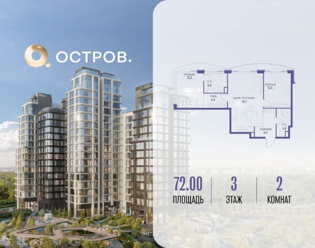 Продаётся двухкомнатная квартира от застройщика: общая площадь 66.70 м², жилая 24.20 м², кухня 22.40 м², 5, жилой квартал "Остров 12", корпус 1 (12.1 квартал) (секция 2). срок сдачи: 4-кв. 2025. , 2 санузла: 2 совмещенных. В жилой зоне 2 больших окна на одну сторону, хорошая инсоляция. Позвоните сейчас и забронируйте квартиру! Купите квартиру для курортной жизни в Москве в квартале ОСТРОВ.12.1. Это единственный на ОСТРОВЕ квартал бизнес-класса, расположенный на первой линии у реки - здесь царит атмосфера ежедневного отпуска. Дома созданы в узнаваемом футуристичном стиле и выглядят как произведения современного искусства. Для жителей предусмотрены фитнес-рум и детский клуб, гостиная и кинотеатр, переговорные и репетиторские комнаты. На крышах устроены видовые общественные пространства с зонами для йоги, коворкингами, лаунжами. Двор-парк располагает всем необходимым для отдыха и общения всех возрастов. ОСТРОВ.12.1 - часть жилого комплекса на западе Москвы, в 15 минутах езды от центра. Это настоящий заповедник посреди большого города, в окружении реки и 650 га заповедников. Здесь все необходимое находится по соседству: от детского сада до супермаркета, от фитнес-зала до серфинг-центра. На территории созданы все условия для отдыха и общения: клубная инфраструктура в домах и дворы-парки, набережные и променады, маршруты для спортсменов, детей и возрастных жителей. В нескольких минутах ходьбы расположена станция метро "Мнёвники" БКЛ. На автомобиле - 10 минут до Москва-Сити и 15 минут до Садового кольца.
