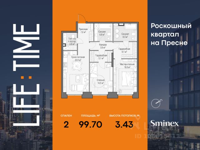 Просторная светлая квартира площадью 99,5 кв. м с окнами на восточную сторону, выходящими на тихую улицу Сергея Макеева, которая является односторонней. Панорамные окна шириной 2,38 метра с возможностью открывания настежь улучшают видовые характеристики квартиры. Продуманная планировка позволяет разместить две спальни с отдельными санузлами и гардеробными. Life Time - роскошный современный квартал на Пресне, в наиболее быстро растущем премиальном районе ЦАО. Его насыщенная инфраструктура и выгодное расположение дарят время для жизни. Вы больше не тратите его на дорогу или ожидание, при этом ни в чём себе не отказывая. На территории предусмотрено всё для комфортной жизни: • двор-парк площадью 1,8 гектара с прудом и фонтанами; • Clubhouse - инфраструктурный центр в отдельном здании с исчерпывающими возможностями для спорта, отдыха и досуга только для жителей; • спортивная инфраструктура на улице и в помещении, в том числе бассейн длиной 25 метров, хот-таб, хаммам, сауна, бьюти-зона; • клубная гостиная с террасой; • всё для развития и досуга детей любого возраста, в том числе детский сад и школа. Life Time находится в центре сложившегося премиального района, в окружении многочисленных парков. Удобная транспортная доступность и прямой выезд на Звенигородское шоссе позволяют без проблем добраться до Садового кольца и Москва-Сити. Архитектурный стиль квартала - роскошный минимализм. Дома десятилетиями будут выглядеть современно.