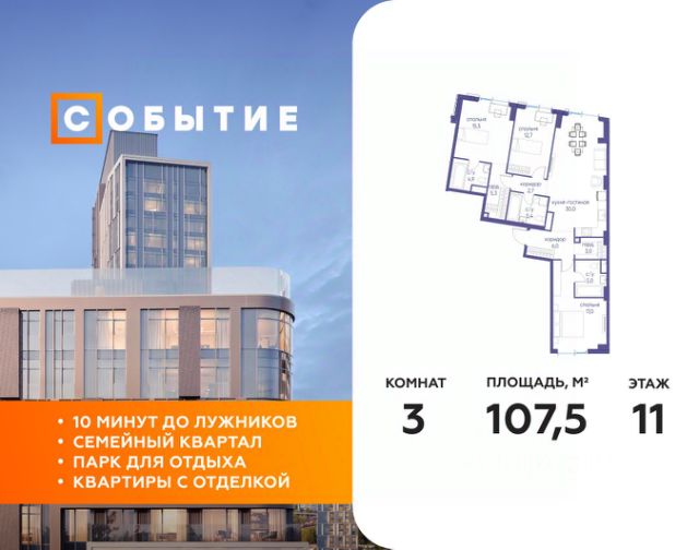 В продаже 2-к квартира от застройщика. Общая площадь 92.70, жилая 36.40, кухня 19.2. Квартира расположена на 7 этаже жилого квартала "Событие-6", корпус 2, Секция 4. Квартира без отделки. Срок сдачи: 4 кв. 2029 года. СОБЫТИЕ.6 — финальный дом парк-квартала СОБЫТИЕ на Мосфильмовской. Переезжайте в уже сформированный квартал с готовой инфраструктурой и парком! Премиальный жилой комплекс в престижном районе Москвы предлагает стильную архитектуру, продуманное благоустройство и великолепно разнообразие общественных пространств. Свой парк прямо возле дома! Архитектура Архитектура СОБЫТИЯ.6 выполнена в ультрасовременном стиле московским бюро Atrium на основе дизайн-кода британских архитекторов LDA Design и UHA London. Дом отличает оригинальная геометрия фасадов, большое остекление и высокие лобби (до 6,2 м) с авторской мебелью и светильниками. Расположение Мосфильмовская улица (Раменки) — один из престижных районов Москвы. Близость к историческому и деловому центру, природным зонам Запада столицы. Транспортная доступность: • 10 мин до Москва-Сити и ТТК; • 15 мин до Садового кольца; • 25 мин до аэропорта Внуково; • 7-10 мин до станций метро "Аминьевская" и "Мичуринский проспект". Инфраструктура: • парк "Событие" (12 га, финалист конкурса Правительства Москвы) с беговыми (1,5 км) и велодорожками (2,7 км), экотропой (1,6 км), площадками, лекторием; • школа, детский сад, магазины, салоны красоты, рестораны (к моменту заселения); • мультидвор с игровыми и спортивными площадками, мини-бульваром; • общественная терраса на 10-м этаже (коворкинг, лаунж); • Закрытые общественные пространства: детская комната, спортивный зал, коворкинг, лаунж-зоны. Паркинг 256 мест для жителей (48 — для электромобилей), 24 гостевых (5 — для электромобилей), мойки колес, кладовые, зоны для велосипедов. Окружение Парки и заповедники (Воробьёвы горы, Матвеевский лес и др.), МГУ, театр им. Н. И. Сац, стадион "Лужники". Безопасность Видеонаблюдение, контроль доступа, видеодомофоны, консьерж-сервис 24/7, системы пожарной безопасности и мультисервисная оптическая сеть.