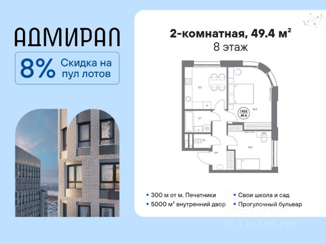 В динамично развивающемся районе Москвы, всего в 300 метрах от метро и в пешей близости от нового городского порта с протяженной набережной 13 км, свободной от автомобилей, продается 2-комнатная квартира площадью 44.10 м². без отделки. Квартира находится в корпусе жилого комплекса бизнес-класса "Адмирал", расположенного по адресу г. Москва, ул. Шоссейная, 4Д. (Застройщик - "Галс Девелопмент"). Новый амбициозный проект "Адмирал" станет частью одного из самых перспективных районов будущего - "Сити-2". В пешей доступности от современных башен Вас ждут живописные Люблинские пруды, 2 усадьбы с уникальной историей и уютный парк "Печатники" у Перервинского плёса. Район имеет отличную транспортную доступность: • 300 метров до станции метро "Печатники"; • Удобная пересадка на БКЛ и станцию МЦД-2; • 10 минут на машине до ТТК; • 15 минут до Садового кольца. Архитектура корпусов отличается динамичностью облика благодаря переменной этажности: высокие башни сочетаются с домами средней этажности. Изящным украшением становятся арочные витражи. Интеллигентный и современный стиль "Адмирала" продолжается в гранд-лобби: пастельные оттенки интерьера и фактурные элементы декора создают атмосферу безмятежного отдыха, особое ощущение простора дарят высокие потолки до 4 м и витражные окна. В домах предусмотрено от трех до шести скоростных лифтов, каждый из них спускается на любой этаж подземного паркинга и обладает удобными сенсорными панелями управления и низким уровнем шума. Благоустроенный двор площадью 5000 кв.м. украсят десятки видов гипоаллергенных растений. Здесь можно совершить приятный променад, по пути заглядывая за свежезаваренным кофе, уединиться за ноутбуком в комфортном коворкинге, занять ребенка играми в двухъярусном плейхабе или помедитировать на специальной площадке для йоги. Мягкий свет декоративных фонарей подчеркнет живописность местности, а чувство безопасности гарантируют круглосуточные системы видеонаблюдения. Дополнительные преимущества: • Высокие потолки от 2,9 до 3,25 м; • Бизнес-центр, школа и детский сад прямо на территории дома; • Подземный двухуровневый паркинг на 1955 машино-мест; • Кладовые помещения в тёплом контуре на 2м этаже; • Стрит-ритейл на первых этажах.