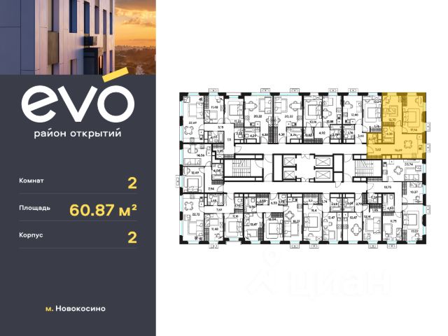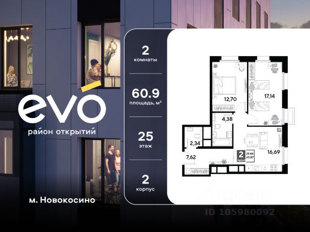 Продается двухкомнатная квартира 61.30 кв.м. в жилом комплексе EVO на 21 этаже по адресу: Московская область, г. Реутов, ул. Комсомольская. EVO - проект комфорт-класса от девелопера Dogma. Каждый житель сможет открыть для себя максимум возможностей. Совершенствоваться во всех направлениях: физическом, эмоциональном и материальном. В EVO можно открыть для себя новые виды спорта, найти единомышленников по хобби, партнеров по бизнесу, развивать в детях новые грани, наслаждаться природой и лаконичной архитектурой. Безопасность - Закрытая территория - Круглосуточное видеонаблюдение - Контроль доступа Расположение Пешком - 7 минут до станции Реутов - 20 минут до метро Новокосино На машине - 4 минуты до МКАД - 6 минут до шоссе Энтузиастов - 9 минут до Носовихинское шоссе - 13 минут до МСД (Московский скоростной диаметр) Более 6 га благоустройства в первой очереди - Зеленый двор без машин, кленовая аллея для прогулок - Нейродинамические площадки для детей разных возрастов - Workout зона, столы для пинг-понга, места для занятия йогой. велодорожки и дорожки для скандинавской ходьбы - Детский сад на 180 мест и школа на 750 мест - Кроссбукинг - Лобби с зоной ожидания, колясочной и лапомойкой - Магазины и кафе на первых этажах Окружение - Реутовский центральный парк, Александровский сквер, Фабричный пруд - ТЦ "Экватор", ТК "Шоколад" - Спортивный комплекс "Старт", Ледовый комплекс "Реутов Арена" - Музей-усадьба "Кусково" Социальная инфраструктура В первой очереди предусмотрено строительство детского сада на 180 мест и школы на 750 учащихся. В 10 минутах ходьбы от EVO находится детский технопарк "Изобретариум", в котором более 60 научных секции: от IT до промышленного дизайна. Для творческих ребят рядом есть художественная и музыкальные школы, хоровая студия.