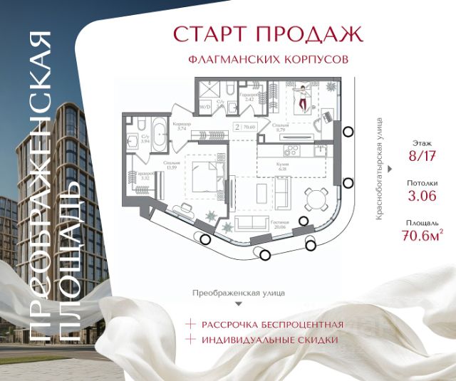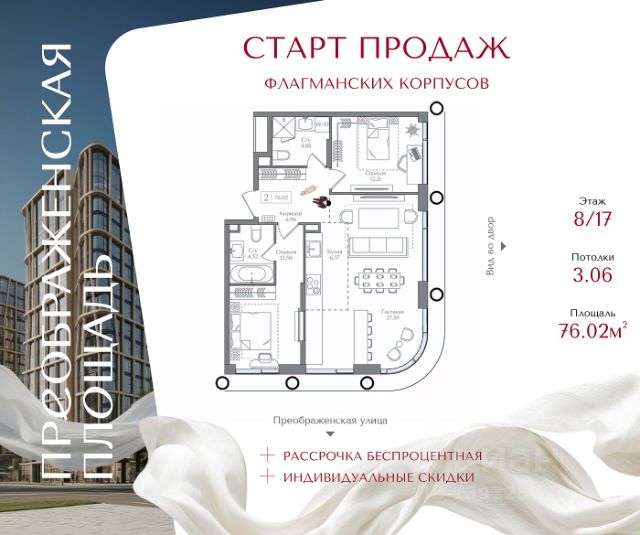 Жилой комплекс "Преображенская площадь" Премиум-класс | старт продаж долгожданных корпусов Открыт старт продаж нового объёма квартир в жилом комплексе "Преображенская площадь". В реализации — долгожданные корпуса проекта, а значит сейчас доступен лучший выбор планировок и наиболее привлекательные условия покупки. Комплекс расположен на первой линии от метро "Преображенская площадь" в историческом районе с развитой инфраструктурой. Удобный выезд позволяет добраться до ТТК всего за 7 минут, до Садового кольца — за 8 минут. Архитектура проекта продумана так, чтобы сохранить ощущение приватности: на каждом этаже расположено всего 35 квартир. Небольшое количество соседей создаёт комфортную, спокойную атмосферу проживания. Входные группы выполнены в формате гранд-лобби с камином, библиотекой и лаунж-зонами. В отделке используются натуральные материалы, формирующие стильное и статусное пространство. Закрытая территория площадью 1,5 га полностью свободна от автомобилей. Пространство двора организовано как ландшафтный парк с прогулочными маршрутами, зонами отдыха и спорта, а также гастропроменадом с кафе и ресторанами. Предусмотрен подземный паркинг с прямым доступом в жилые корпуса. В составе проекта — детский сад и IT-школа 1502 "Энергия", входящая в число лучших школ Москвы и России. Комплекс окружён крупными зелёными зонами: рядом расположены Сокольники, Измайловский и Черкизовский парки, национальный парк "Лосиный остров", ВДНХ и благоустроенная набережная Яузы. Доступна рассрочка 0% при первоначальном взносе от 20%. Старт продаж новых корпусов — возможность приобрести квартиру в премиальном проекте на самых выгодных условиях. Звоните для подробной консультации.