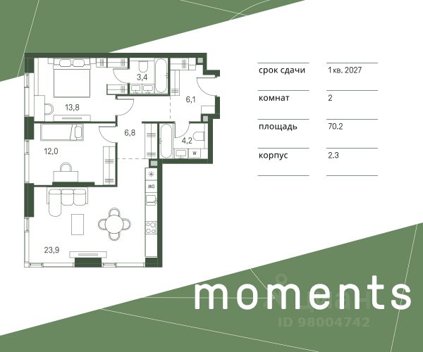 Цены указаны с условием 100% оплаты и стандартной ипотеки. Продается 2-к. квартира номер 1147 общей площадью 56.7 кв.м. на 20-м этаже 34 этажного дома, корпус 2.2. С отделкой White Box. Moments — ЖК бизнес-класса, расположен на расстоянии вытянутой руки от старинного усадебного парка Покровское-Стрешнево. Moments — это единение города и природы, дом, который помогает обрести гармонию и баланс в жизни. Moments расположен на Волоколамском шоссе с удобным выездом в центр и в область, а также с расположенными в пешей доступности объектами транспортной инфраструктуры (МЦК и МЦД-2). Жилой комплекс будет состоять из 3 очередей — 8 корпусов высотой от 4 до 47 этажей. Здания будут расположены под разными углами для максимальной открытости солнцу и максимально роскошным видовым характеристикам. Внутренний двор: Иммерсивное благоустройство от британского бюро Gillespies и West8 сфокусировано на эмоциональном и чувственном опыте. Каждая прогулка по Moments погружает в путешествие со сменой сценариев и плавным потоком уникальных моментов. - Пешеходная экотропа,которая соединяет комплекс с парком Покровское-Стрешнево - Двор с фонтаном - Зеленые сады и лаунж-зоны - Пространства для пикников и общения - Зоны активного отдыха. Детские и спортивные площадки - Пешеходные тропы и велодорожки - Разнообразная коммерческая инфраструктура - Детский сад на 175 мест - Школа на 300 мест - Игровые площадки из натуральных материалов - Сенсорные сады - Безбарьерное зонирование