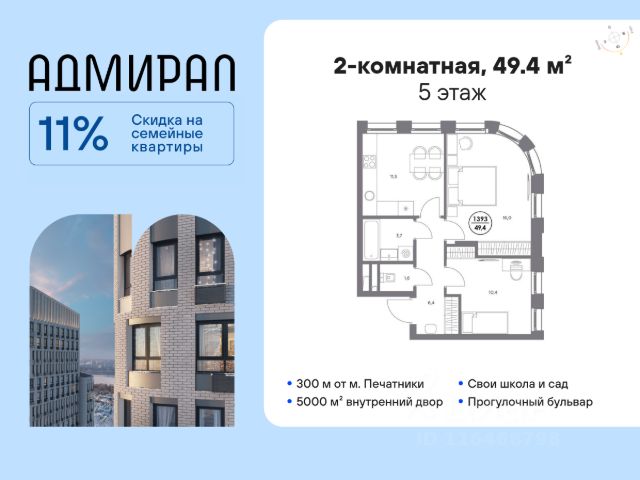 В динамично развивающемся районе Москвы, всего в 300 метрах от метро и в пешей близости от нового городского порта с протяженной набережной 13 км, свободной от автомобилей, продается 2-комнатная квартира площадью 48.20 м². без отделки. Квартира находится в корпусе жилого комплекса бизнес-класса "Адмирал", расположенного по адресу г. Москва, ул. Шоссейная, 4Д. (Застройщик - "Галс Девелопмент"). Новый амбициозный проект "Адмирал" станет частью одного из самых перспективных районов будущего - "Сити-2". В пешей доступности от современных башен Вас ждут живописные Люблинские пруды, 2 усадьбы с уникальной историей и уютный парк "Печатники" у Перервинского плёса. Район имеет отличную транспортную доступность: • 300 метров до станции метро "Печатники"; • Удобная пересадка на БКЛ и станцию МЦД-2; • 10 минут на машине до ТТК; • 15 минут до Садового кольца. Архитектура корпусов отличается динамичностью облика благодаря переменной этажности: высокие башни сочетаются с домами средней этажности. Изящным украшением становятся арочные витражи. Интеллигентный и современный стиль "Адмирала" продолжается в гранд-лобби: пастельные оттенки интерьера и фактурные элементы декора создают атмосферу безмятежного отдыха, особое ощущение простора дарят высокие потолки до 4 м и витражные окна. В домах предусмотрено от трех до шести скоростных лифтов, каждый из них спускается на любой этаж подземного паркинга и обладает удобными сенсорными панелями управления и низким уровнем шума. Благоустроенный двор площадью 5000 кв.м. украсят десятки видов гипоаллергенных растений. Здесь можно совершить приятный променад, по пути заглядывая за свежезаваренным кофе, уединиться за ноутбуком в комфортном коворкинге, занять ребенка играми в двухъярусном плейхабе или помедитировать на специальной площадке для йоги. Мягкий свет декоративных фонарей подчеркнет живописность местности, а чувство безопасности гарантируют круглосуточные системы видеонаблюдения. Дополнительные преимущества: • Высокие потолки от 2,9 до 3,25 м; • Бизнес-центр, школа и детский сад прямо на территории дома; • Подземный двухуровневый паркинг на 1955 машино-мест; • Кладовые помещения в тёплом контуре на 2м этаже; • Стрит-ритейл на первых этажах.