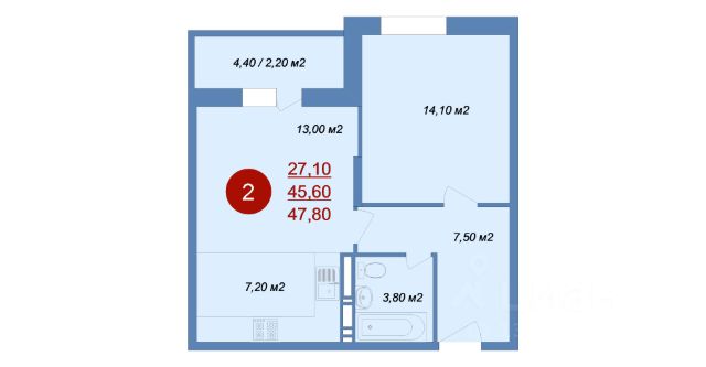 Общая площадь: 44.40 м.кв., Жилая площадь: 21.70 м.кв., Площадь кухни: 15.20 м.кв.