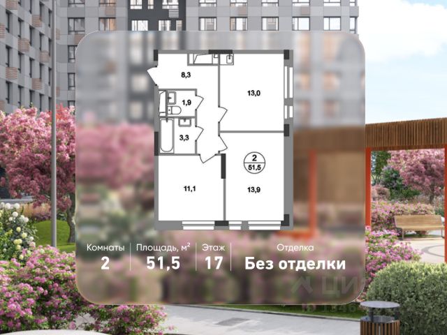 Продается двухкомнатная квартира без отделки в 9 квартале города-парка "Первый Московский". Общая площадь квартиры - 57,4 кв. м, этаж 17 из 19. Срок сдачи - 4 квартал 2026 года. Тип дома - монолитный. Только до 11.05.26 г. - АКЦИЯ "ПОЙМАЙ МАЙ" : -скидки на покупку квартиры -выгодные условия на приобретение квартиры в ипотеку -бронирование 5 тыс.₽ входит в стоимость квартиры -бесплатная регистрация договора -гарантированные подарки при покупке *срок проведения акции с 25.04.26 г. по 11.05.26 г. Информацию об организаторе акции, правилах ее проведения, количестве призов, сроках, месте и порядке их получения уточняйте в офисе продаж. Корпус состоит из 2х секций, без отделки. Город-парк "Первый Московский" расположен всего в 7 км по Киевскому шоссе от МКАД на территории Новой Москвы. Из города-парка прямой выезд на Киевское шоссе и трассу Солнцево-Бутово-Варшавское шоссе. ТРАНСПОРТНАЯ ДОСТУПНОСТЬ: - 5 мин. на личном автомобиле или 10 мин. на автобусе 189, 147, 193 до станции метро "Филатов Луг" - 5 мин. на личном автомобиле или 12 мин. на автобусе 863 до станции метро "Саларьево" - 6 мин. на личном автомобиле или 15 мин. на автобусе 333 до станции метро "Рассказовка" РАЗВИТАЯ ИНФРАСТРУКТУРА В ОКРУЖЕНИИ: - общеобразовательная школа 2120 корпуса д1, д7, ш1-ш5 - детский сад 2120 корпуса д2, д9 - школа искусств - городская больница, детская поликлиника, филиал 5 - подстанция скорой помощи 58 и пожарно-спасательный центр 313 - отдел полиции, отдел ГИБДД - торговые центры Столица и Новомосковский - стадион, каток, бассейн - кафе, продуктовые магазины, аптеки, фитнес центры, салоны красоты и пр. БЛАГОУСТРОЙСТВО: - детская площадка для малышей и детей до 12 лет - места отдыха для родителей в непосредственной близости - озеленение территории с учетом зонирования - максимальная близость корпуса к пару Филатов луг ОСОБЕННОСТИ АРХИТЕКТУРЫ: - безбарьерные входные группы - колясочные в каждой входной группе - коммерческие помещения на 1 этаже в двух секциях - кладовые помещения расположены на жилых этажах и на -1 этаже - в каждой секции корпуса по 3 лифта: 2 пассажирских, 1 грузовой - на фасадах предусмотрены корзины для установки внешних блоков кондиционеров - видеонаблюдение установленное в холлах первых этажей, у подъездов и прилегающей территории АВТОРСКИЙ ДИЗАЙН: Входные группы выполнены по авторскому дизайну, оснащены системой "тёплый пол". В каждой входной группе будет располагаться комфортабельная зона ожидания, почтовые ящики с ячейкой для спама, колясочная, акцентные пуфы и столик.
