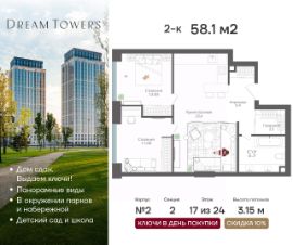 Рассрочка 0% от застройщика. Ключи в день покупки. ЖК Dream Towers проект премиум-класса в окружении парков и набережной, с полностью готовой инфраструктурой для комфортной жизни и отдыха. Продаётся 2-квартира на 17 этаже 24-этажного дома (2 корпус). Общая площадь: 58.1 кв.м. Высота потолков от 3.15 м. Город-курорт на 100 Га в шаге от вашего дома: - пляжный комлекс Dream Beach Club; - парк аттракционов Остров Мечты; - 44 Га ландшафтных парков; - пешеходная набережная; - яхт-клуб; - Южный речной вокзал; - вейк-парк и многое другое. В Dream Towers предусмотрено все для комфортной жизни с семьей: - дизайнерские лобби с общественной гостиной, колясочной и лапомойками; - охраняемый благоустроенной двор только для жителей; - собственный десткий сад и школа прямо во дворе; - красивая архитектура зданий в стиле Ар-деко; - облицовка фасадов из натурального камня с архитектурной подсветкой; - широкоформатное остекление окон в пол для лучших видовых характеристик на парки и пойму Москвы-реки; - подземный паркинг; - клубный формат проживания; - эргономичные планировки от 40 до 162 м2; - высокие потолки от 3,15 до 4,1 м; - квартиры с террасами; - вся необходимая инфраструктура на первых этажах домов, а также в торговой части тематического парка "Остров Мечты" (рестораны, кафе, супермаркет, магазины, салон красоты, йога-студия и многое другое). Центр рядом: 15 минут до Садового кольца на авто, 20 минут до Сити или Кремля. В 5 минутах прогулочным шагом — станция метро "Технопарк".